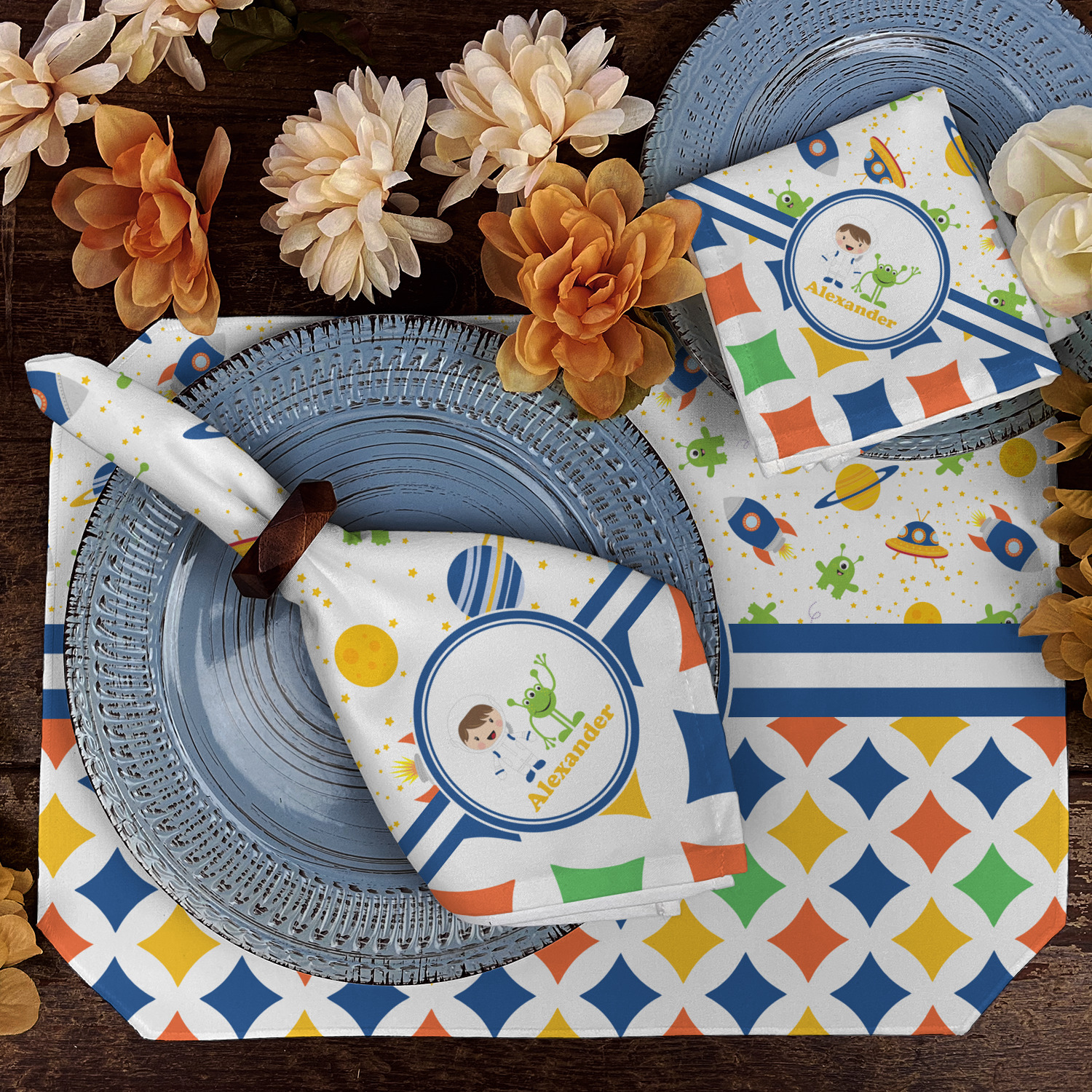 Each customizable cloth napkin is a polyester material guaranteed for long-term use. Since our napkins are cloth, it serves as a great reusable and eco-friendly dining decor. We sell personalized napkins individually or as a set of 4! Print your own unique design on all four napkins, or create four individual designs for each napkin! We offer two different napkin sizes - Cocktail napkins (approx. 10 x 10) and Dinner napkins (approx. 20 x 20). We print your design on one side, perfect for displaying your custom designed lunch napkins in any fold or table setting!