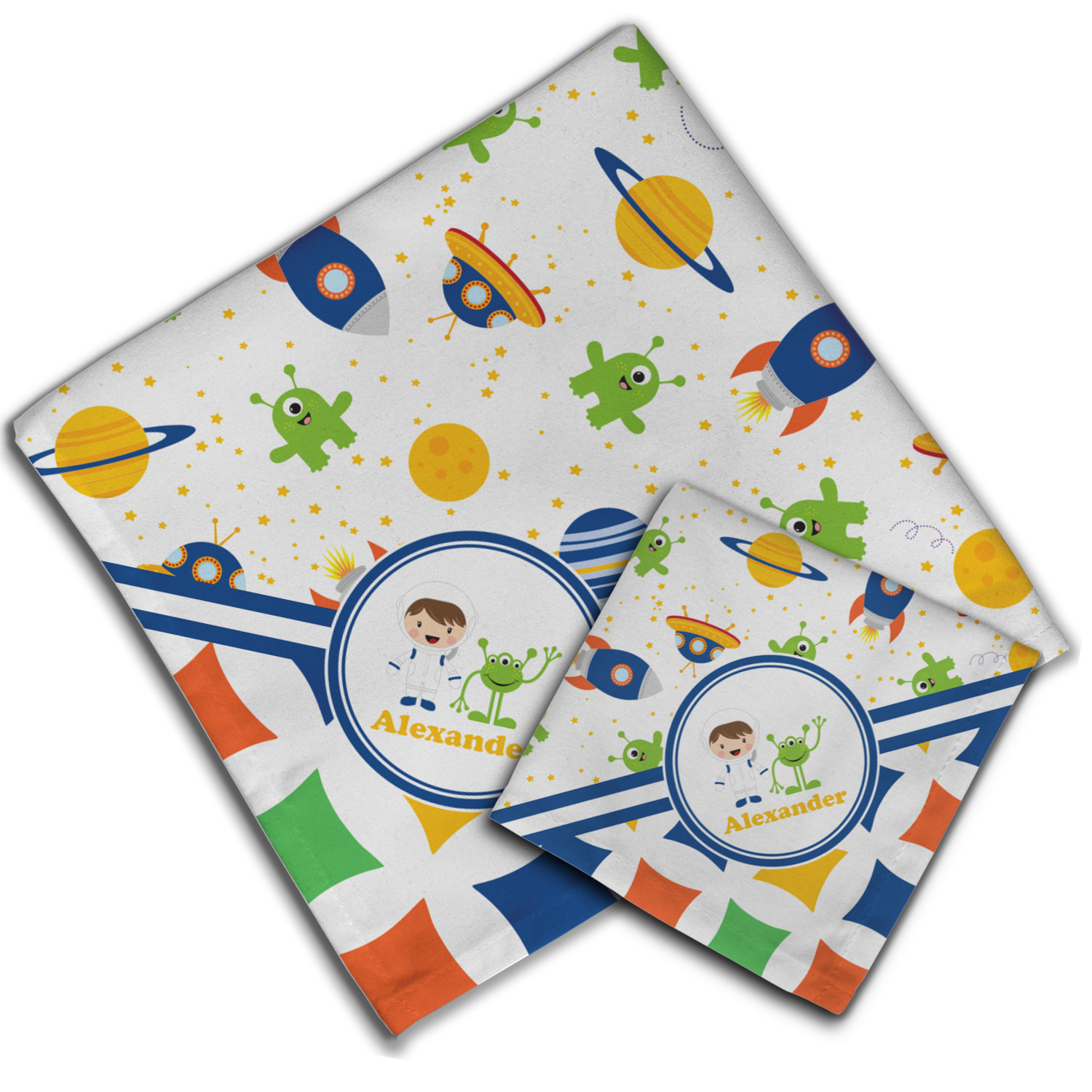 A blue and white band is placed in the middle of the design and used to showcase your little space traveler and his martian buddy. Add your own personalization for that special touch.