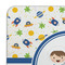 A blue and white band is placed in the middle of the design and used to showcase your little space traveler and his martian buddy. Add your own personalization for that special touch.