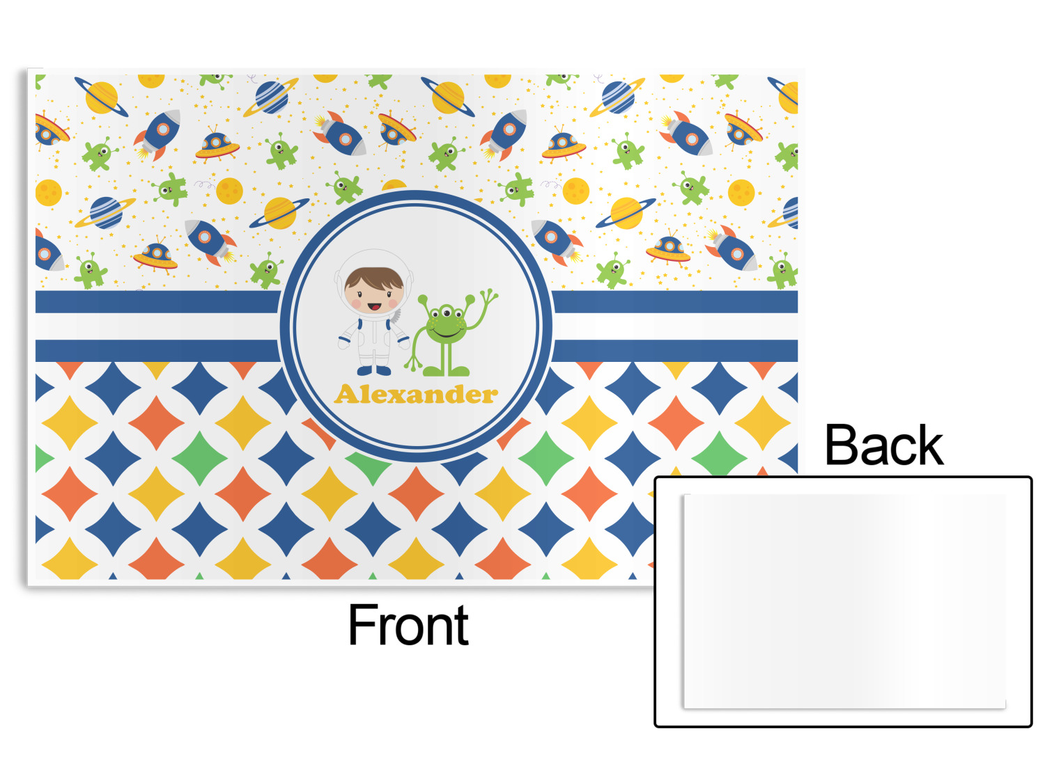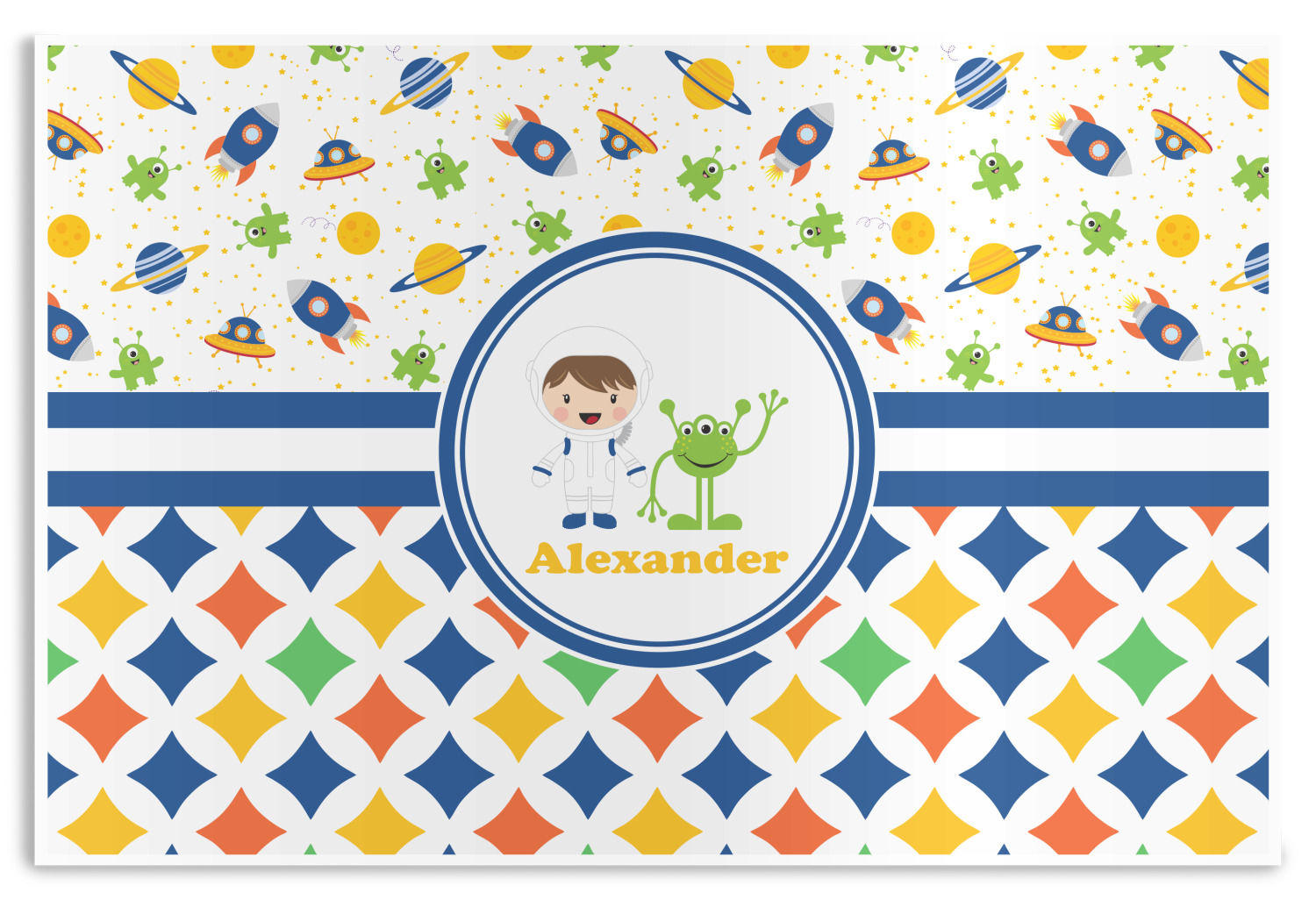 A blue and white band is placed in the middle of the design and used to showcase your little space traveler and his martian buddy. Add your own personalization for that special touch.