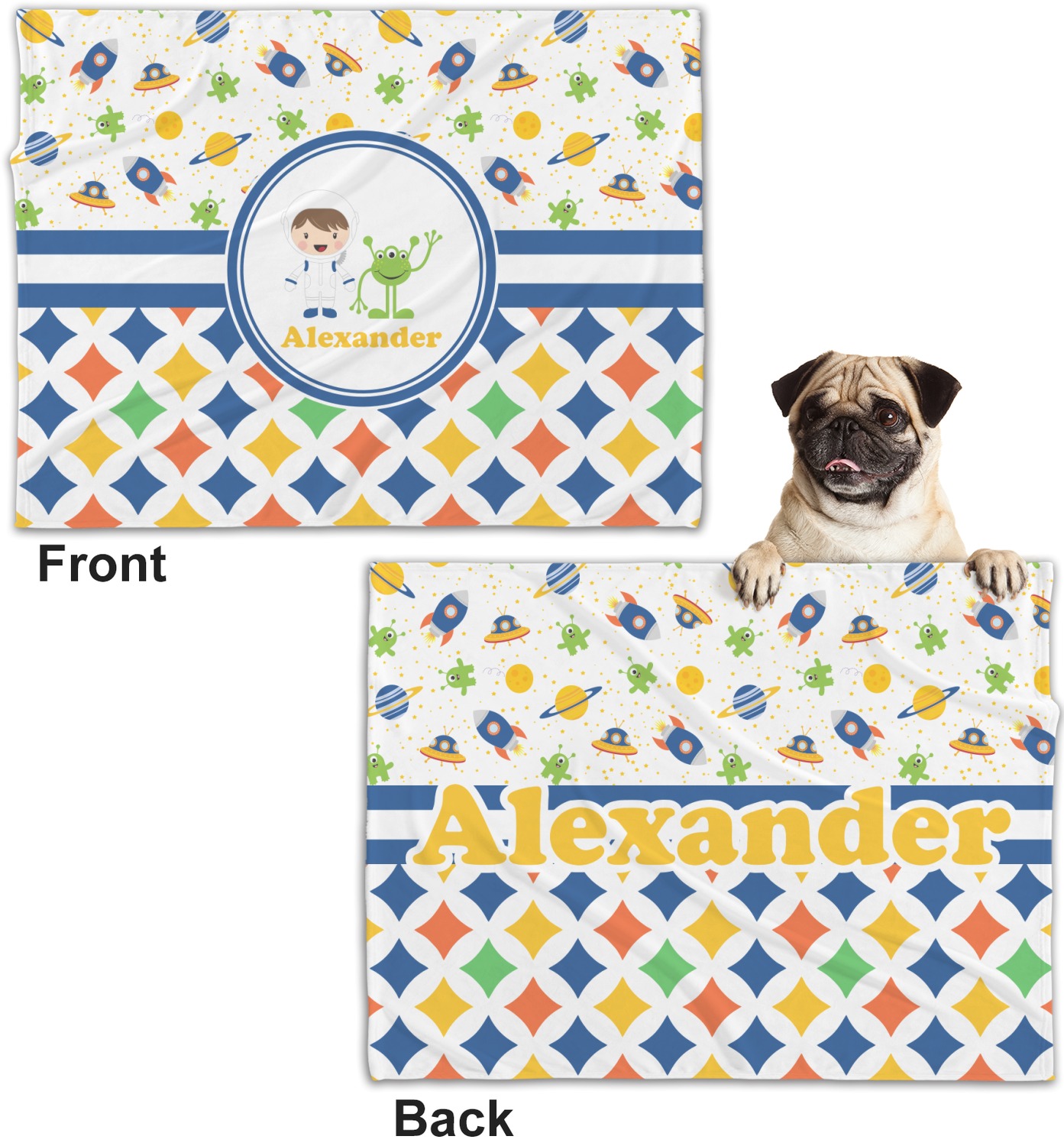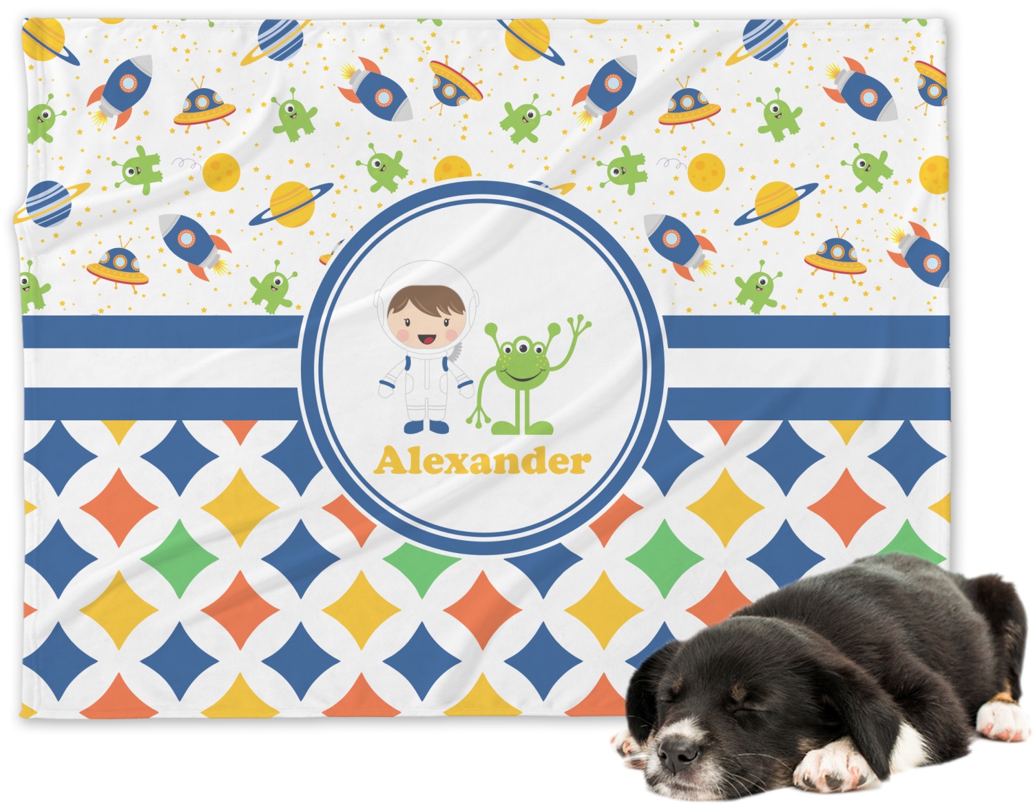 A blue and white band is placed in the middle of the design and used to showcase your little space traveler and his martian buddy. Add your own personalization for that special touch.