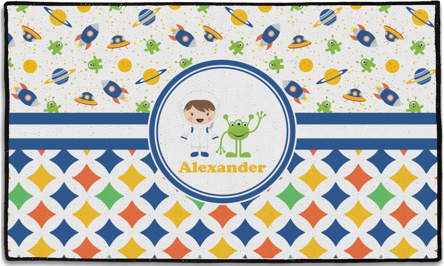 A blue and white band is placed in the middle of the design and used to showcase your little space traveler and his martian buddy. Add your own personalization for that special touch.