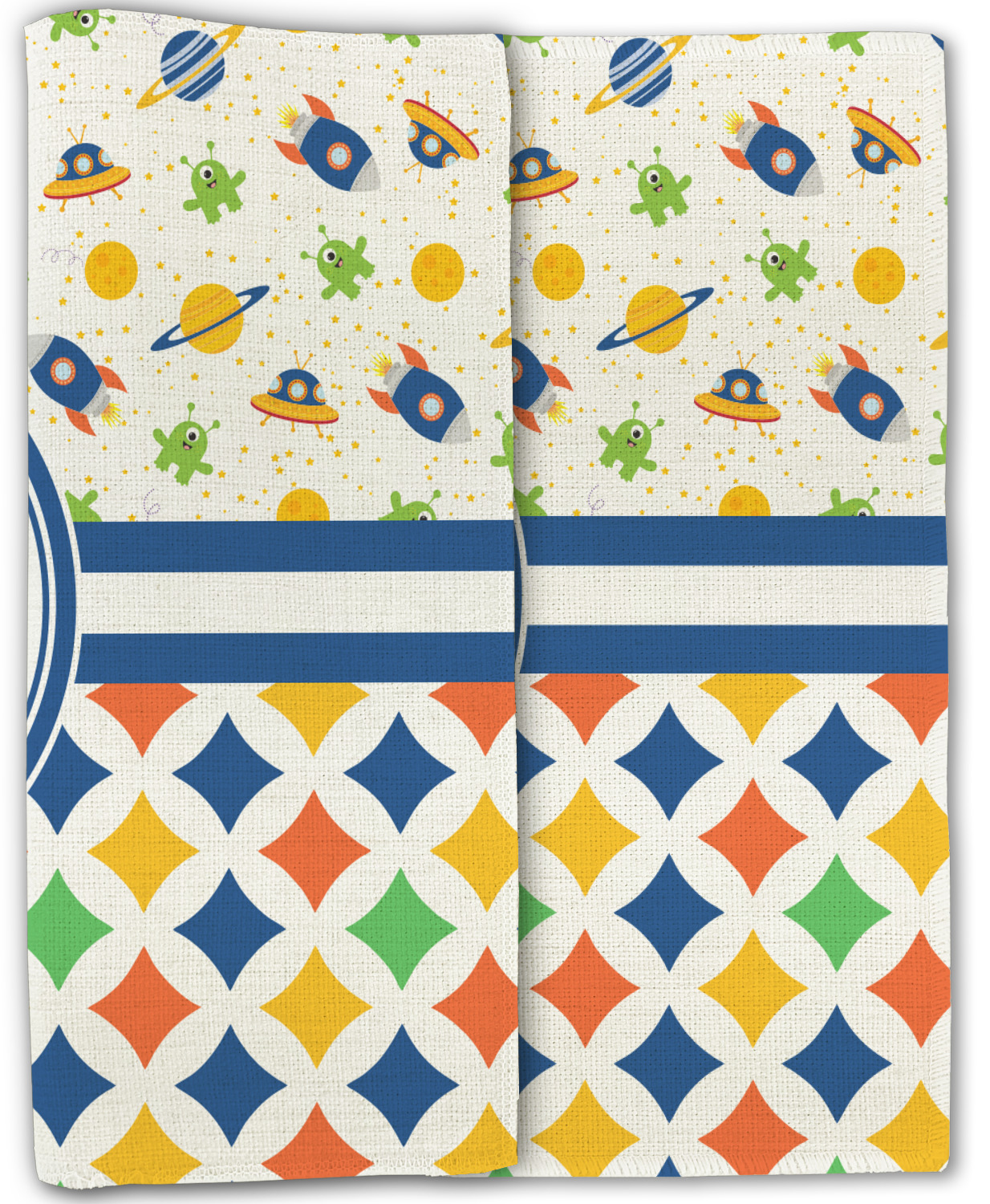 Explore another galaxy with this whimsical space design. Fun colors of blue, orange, yellow, and green make this space exploration come alive. The design is full of little green martians, blue and orange rockets, blue, yellow, and orange spaceships, yellow and blue planets, and yellow stars galore. A retro-future diamond pattern using coordinating colors makes this design outta this world!