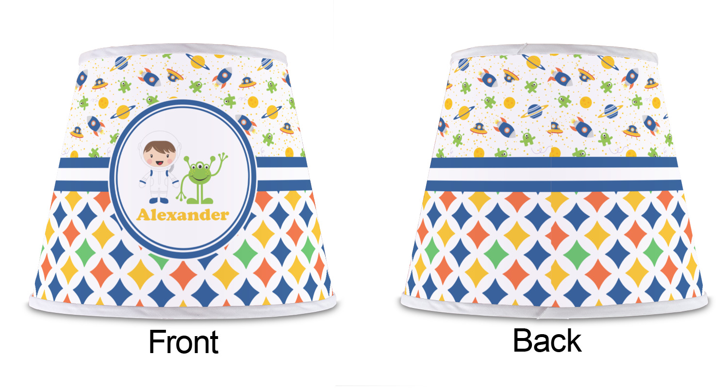 The base of this lampshade is 12 inches in diameter, and the top spans 8 inches in diameter. The total height of the lampshade is 10 inches. The angled nature of this custom lampshade concentrates the light, making it ideal for smaller spaces. This lampshade is made of matte, polyfilm, and displays your customization in its middle. The top and bottom of this colorful lamp shade are lined with a white fabric ribbon (which can be replaced with black inside the design studio) which frames your design and creates a sophisticated finish. As an UNO fitter lampshade, this unique lamp shade will fit a variety of bases.