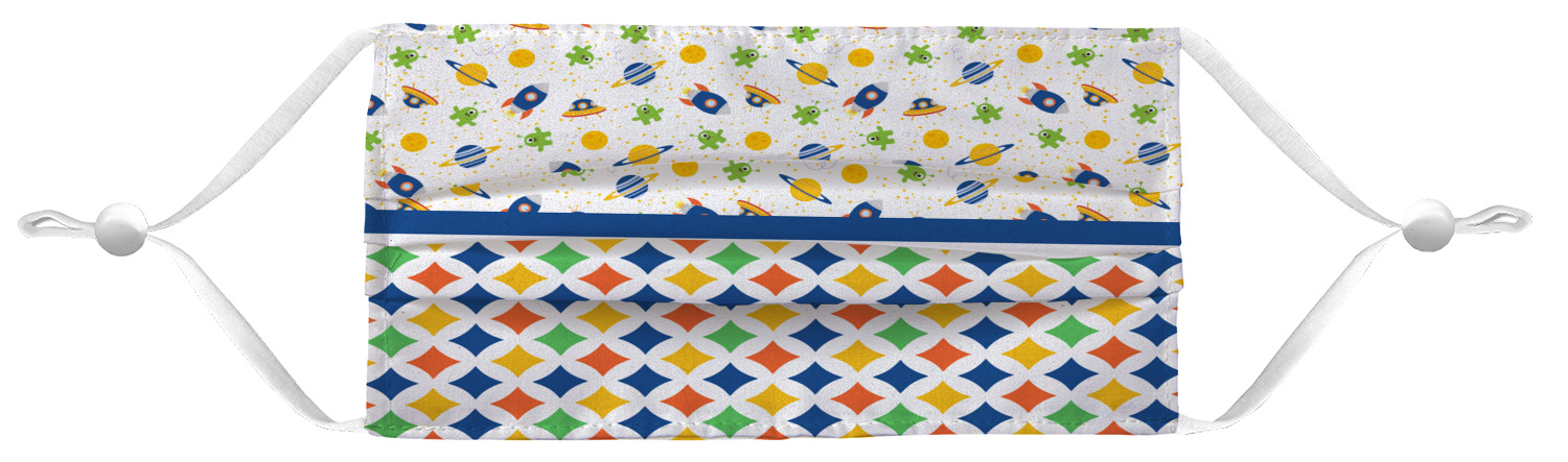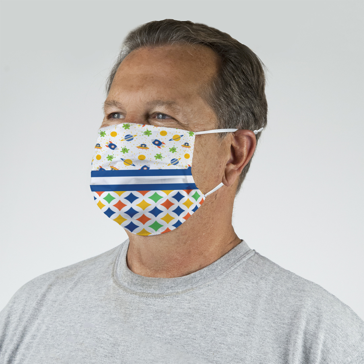 These fun face masks are 7" wide and 3.5" high. They feature pleats, adjustable ear loops, and are made with two layers of fabric. The top layer where your design is printed is a breathable polyester sheeting, while the inside layer is a soft microfiber polyester