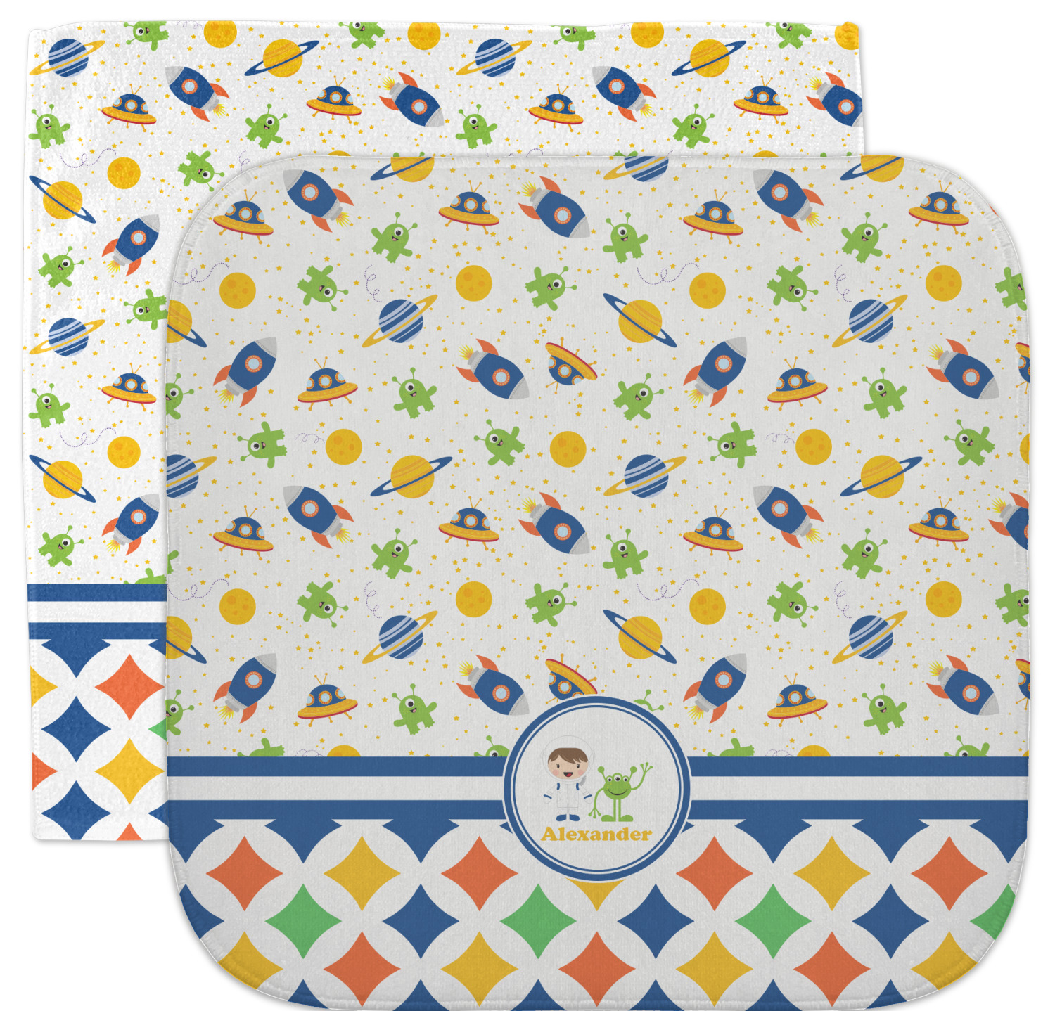 Explore another galaxy with this whimsical space design. Fun colors of blue, orange, yellow, and green make this space exploration come alive. The design is full of little green martians, blue and orange rockets, blue, yellow, and orange spaceships, yellow and blue planets, and yellow stars galore. A retro-future diamond pattern using coordinating colors makes this design outta this world!