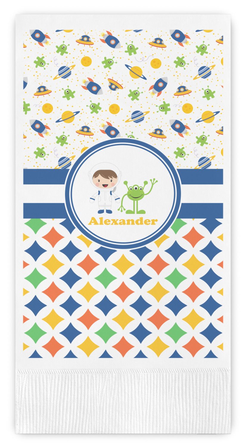 A blue and white band is placed in the middle of the design and used to showcase your little space traveler and his martian buddy. Add your own personalization for that special touch.