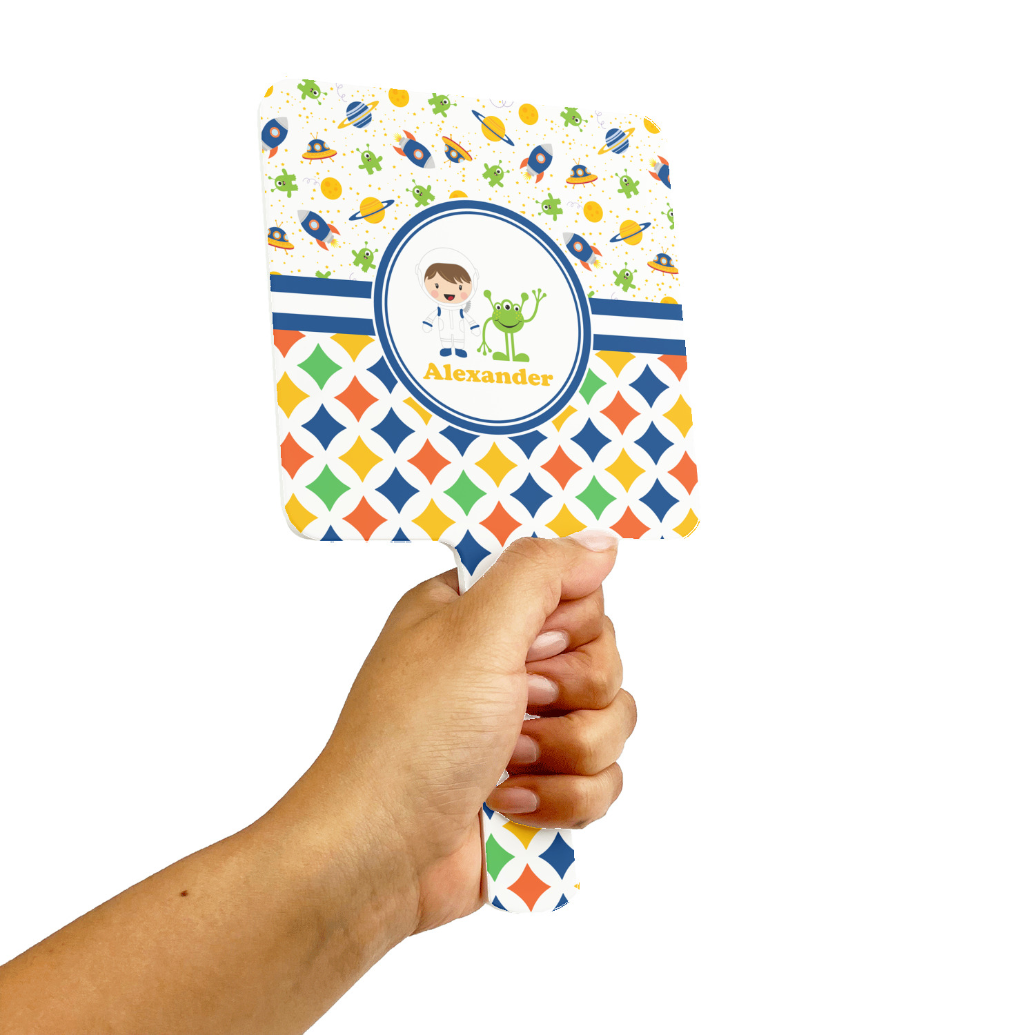A blue and white band is placed in the middle of the design and used to showcase your little space traveler and his martian buddy. Add your own personalization for that special touch.