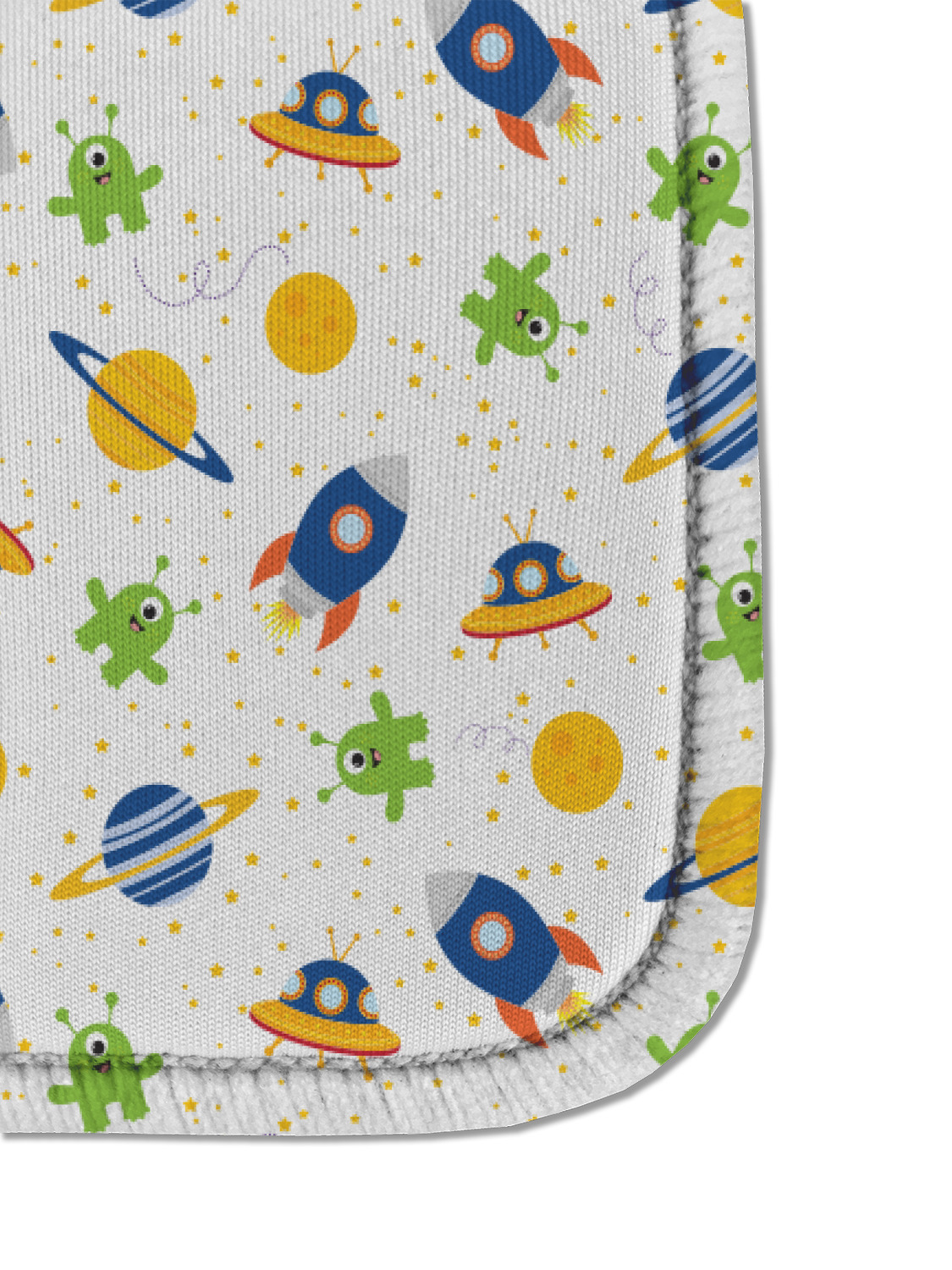 Explore another galaxy with this whimsical space design. Fun colors of blue, orange, yellow, and green make this space exploration come alive. The design is full of little green martians, blue and orange rockets, blue, yellow, and orange spaceships, yellow and blue planets, and yellow stars galore. A retro-future diamond pattern using coordinating colors makes this design outta this world!