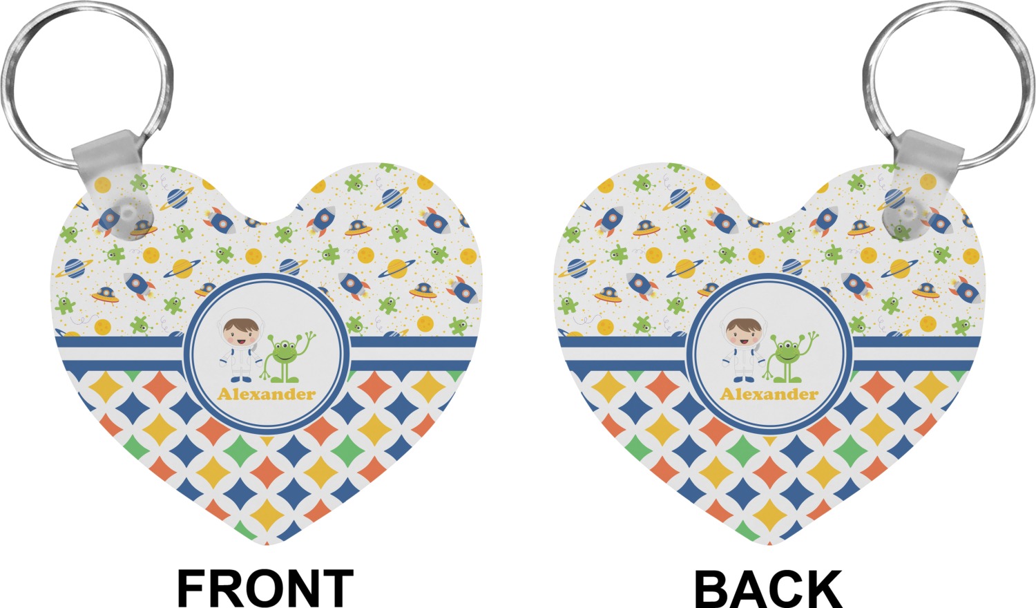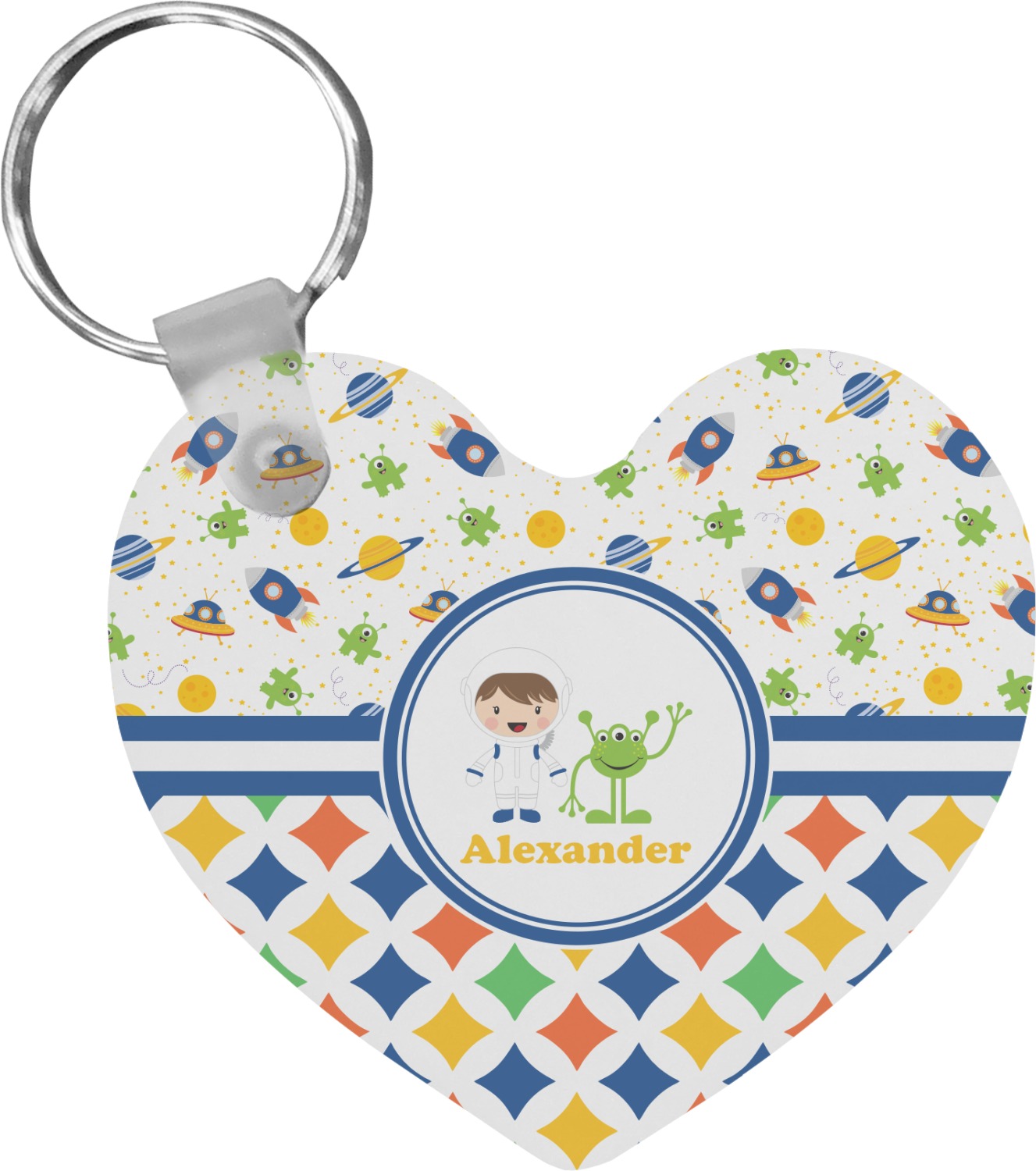 A blue and white band is placed in the middle of the design and used to showcase your little space traveler and his martian buddy. Add your own personalization for that special touch.