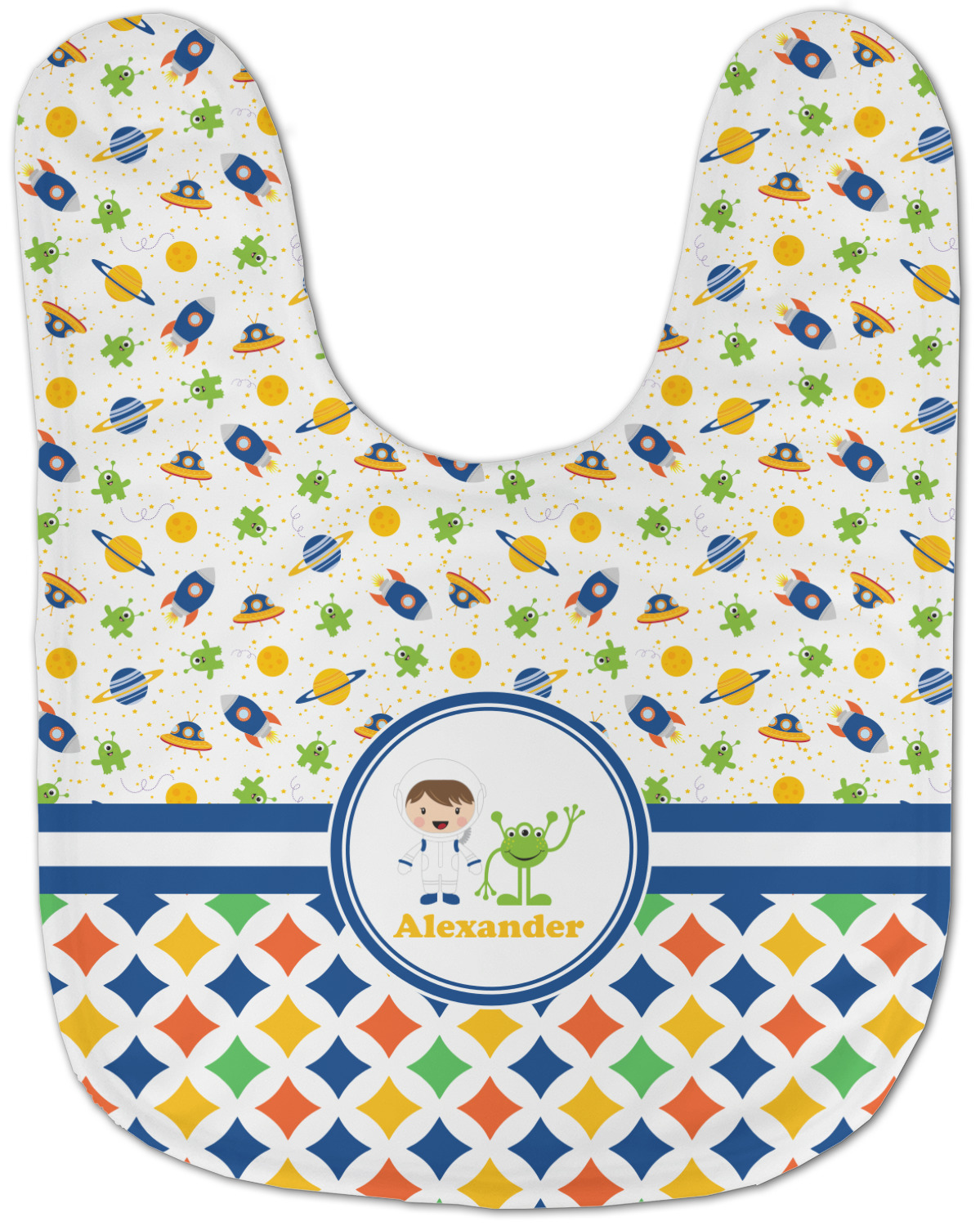 Made of soft polyester, each customizable bib hugs comfortably around the neck to catch every drip and drool. Each bib design is printed with baby-safe ink and finished with a secure stitch pattern and velcro clasp. We carry two customizable bib styles -Microfiber Velour and Jersey Knit.