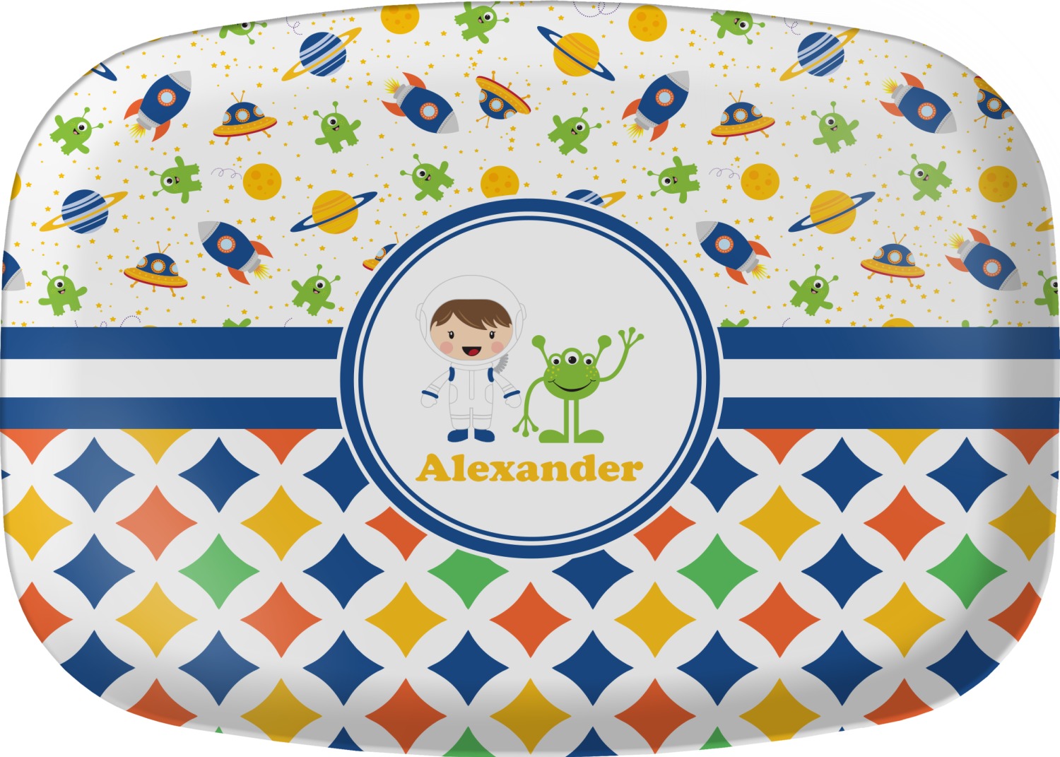 A blue and white band is placed in the middle of the design and used to showcase your little space traveler and his martian buddy. Add your own personalization for that special touch.