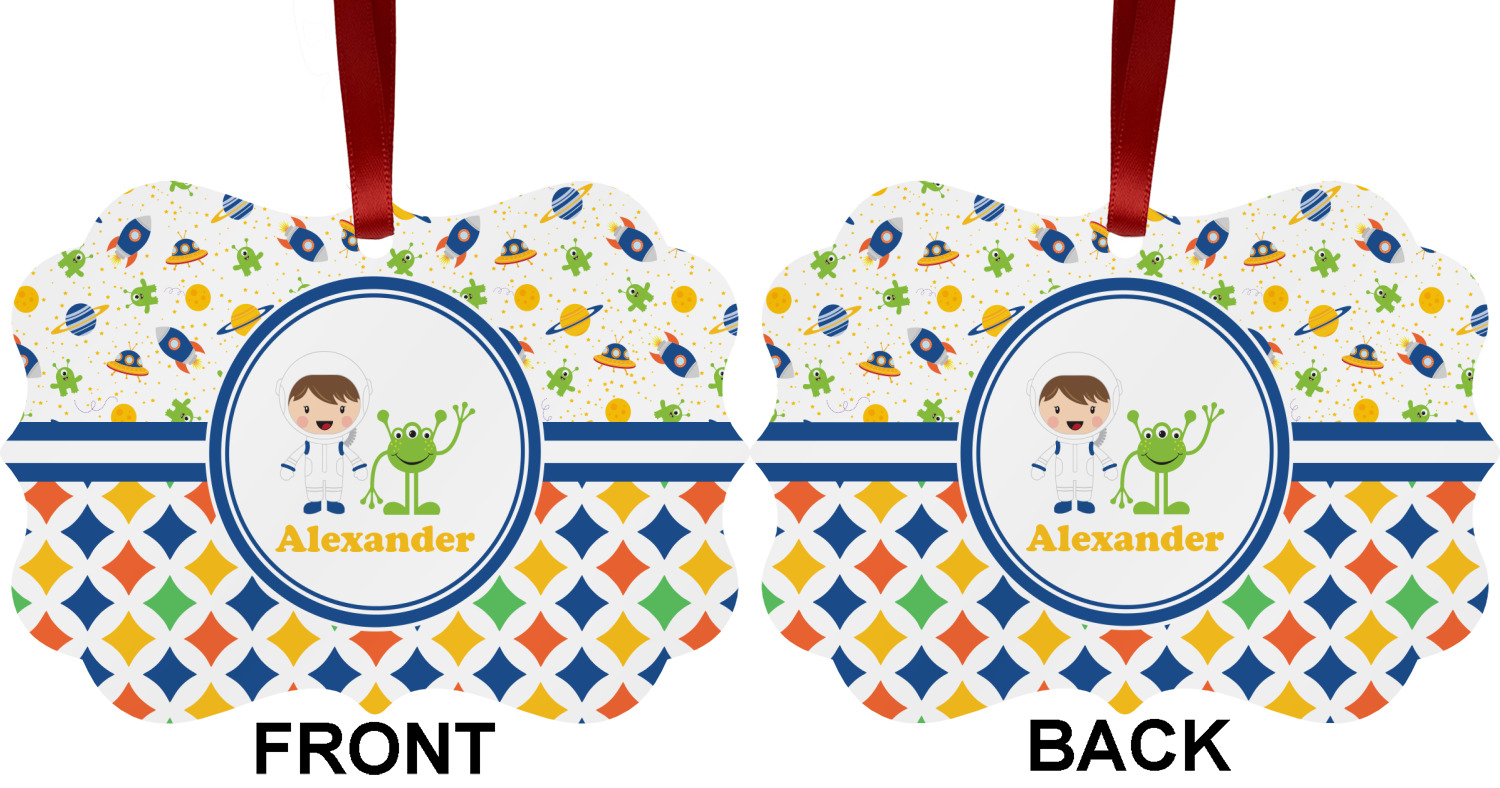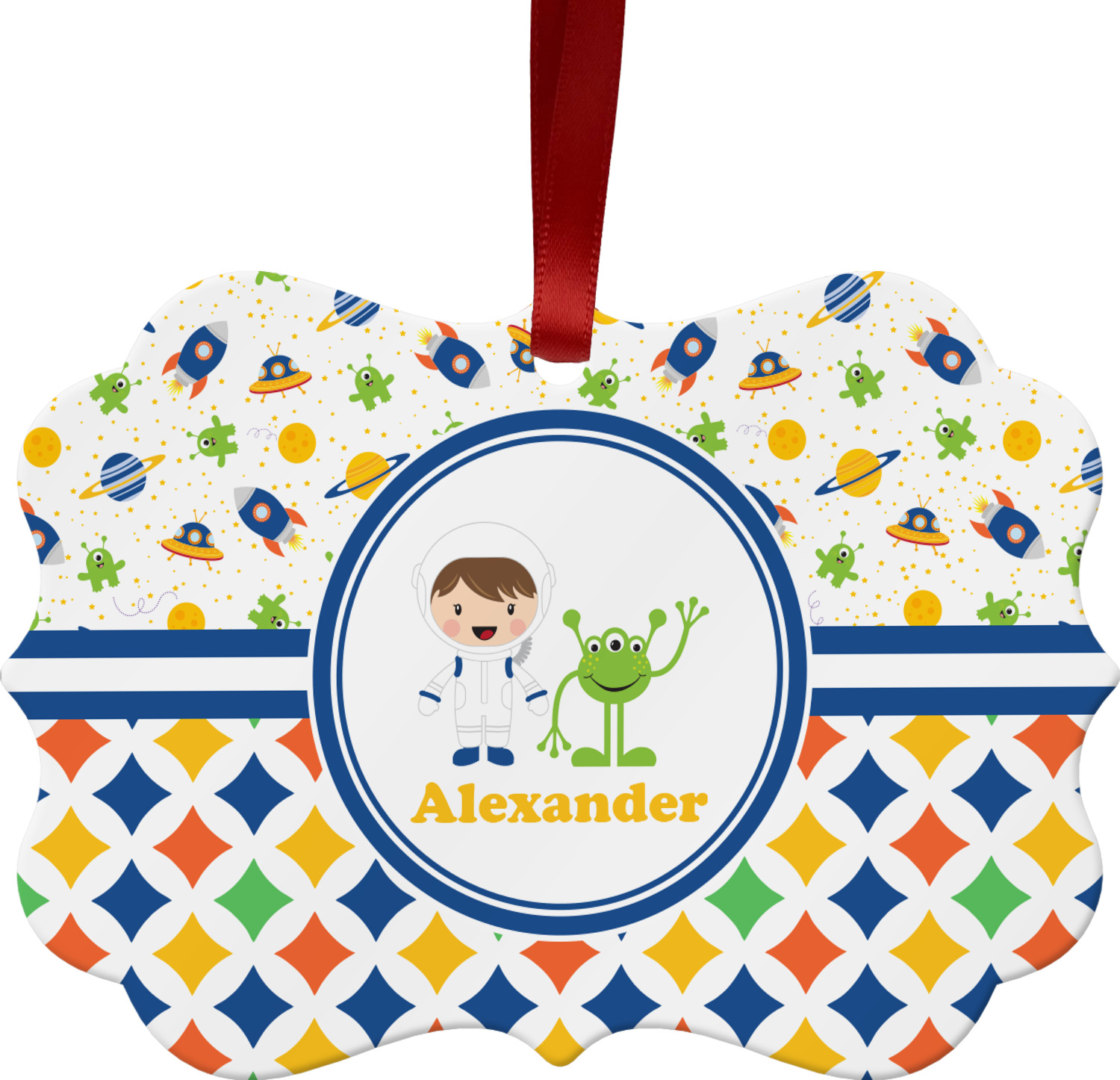A blue and white band is placed in the middle of the design and used to showcase your little space traveler and his martian buddy. Add your own personalization for that special touch.