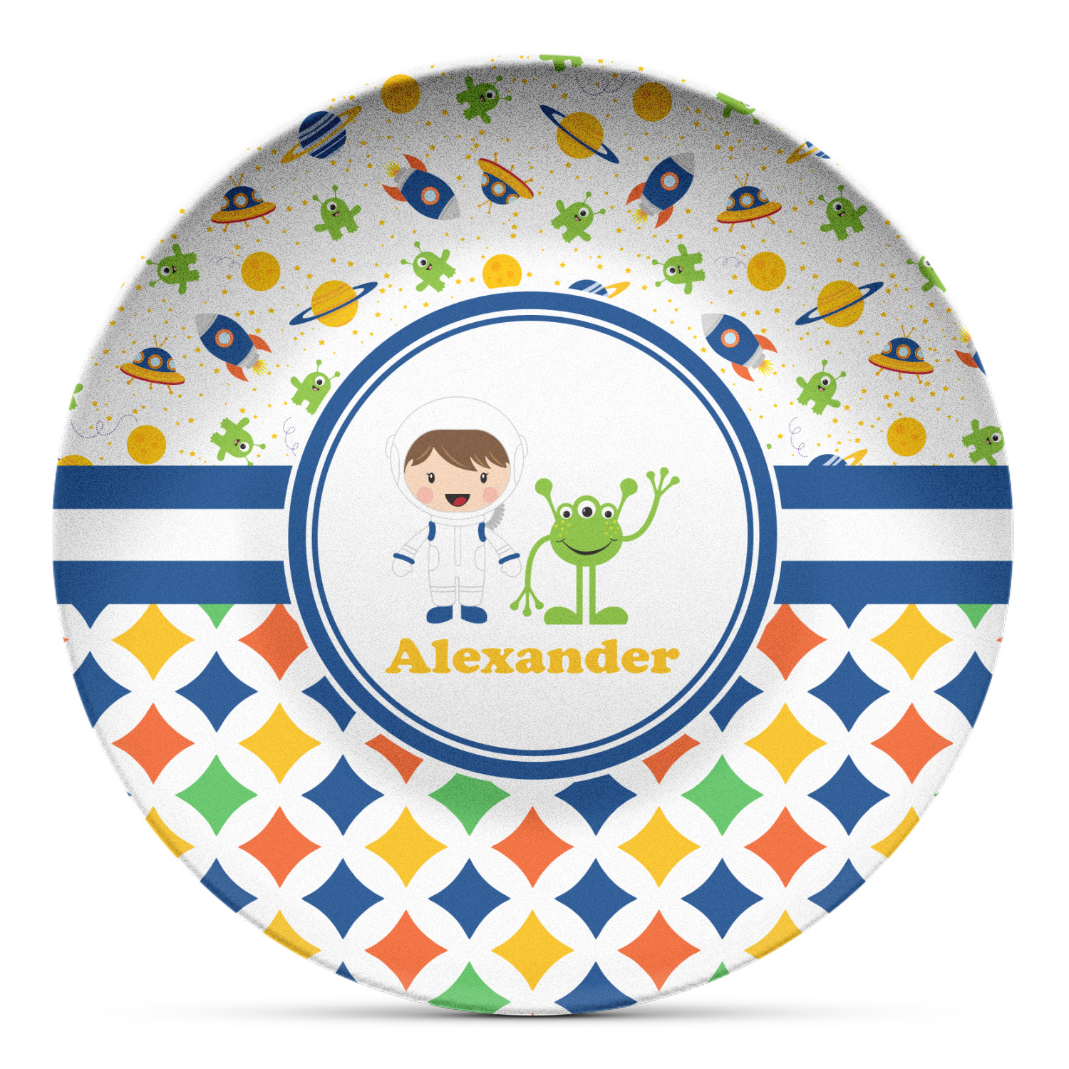 A blue and white band is placed in the middle of the design and used to showcase your little space traveler and his martian buddy. Add your own personalization for that special touch.