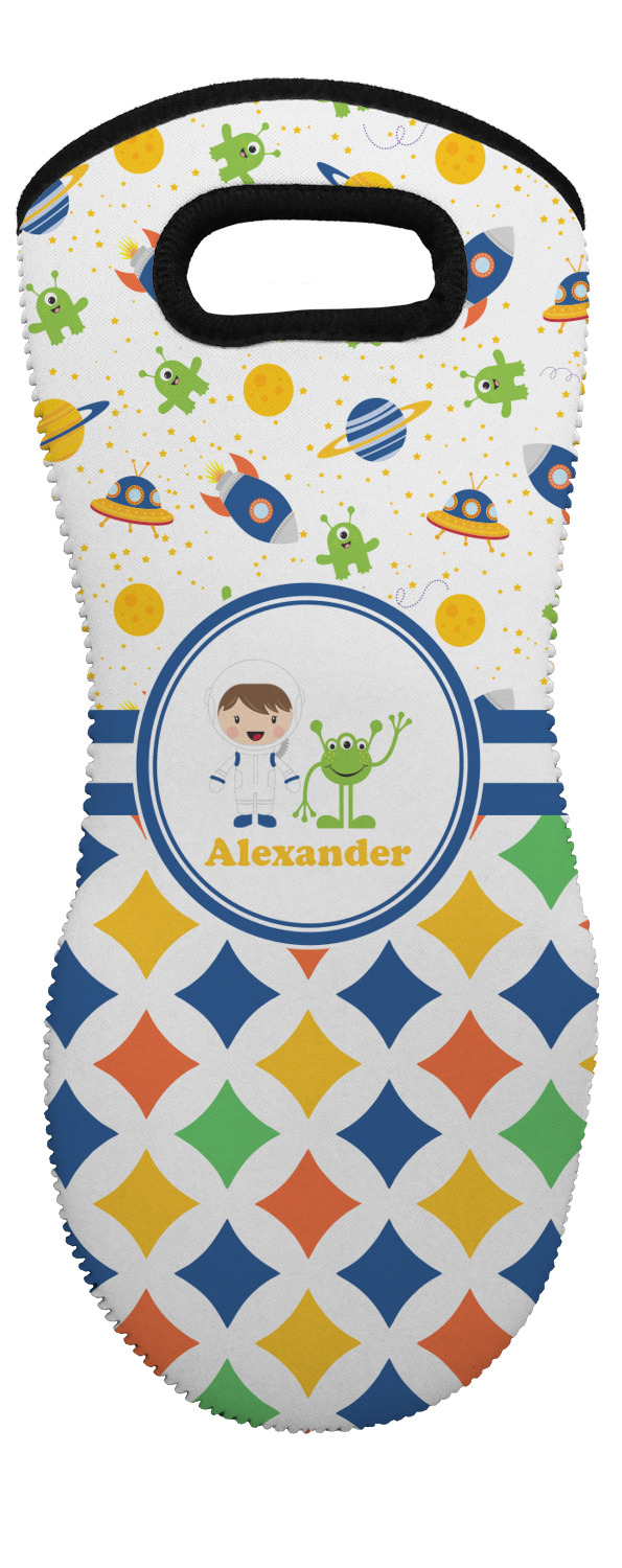 These heat resistant gloves are made entirely of a durable neoprene; the front features a softer texture, while the palm's side has a textured surface, meant to handle heat up to 500 degrees Fahrenheit. Thick, heavy duty stitching connects the two sides. A small, oval cutout appears on the front, and can be used to hang and store the mitt. Your personalization appears on the front, and the upper part of the back of the mitt. The style of these oven mitts are suitable for both the right and left hand, depending on your needs. If you need one for each hand, be sure to order two!