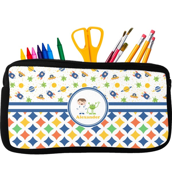 Built from durable neoprene, these pencil pouches, are water resistant, and prevent leaking ink from spilling into your backpack or purse. These custom pencil cases secure with a robust, black zipper. We print your personalized design on the front of this pouch, while the remaining sides a simple black color. These colored pencil cases [880] are sold in two sizes; our smaller version measures at 8.5 by 4.5 inches, while the medium measures at 10.5 by 6.5 inches. The smaller size is more suitable for holding pencils and pens, while our medium size can accommodate pencil sharpeners, scissors, and erasers.