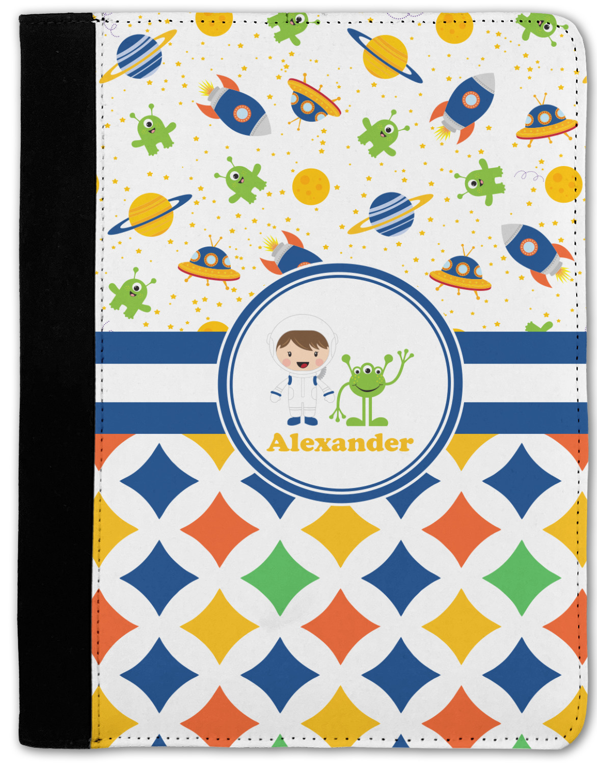 A blue and white band is placed in the middle of the design and used to showcase your little space traveler and his martian buddy. Add your own personalization for that special touch.