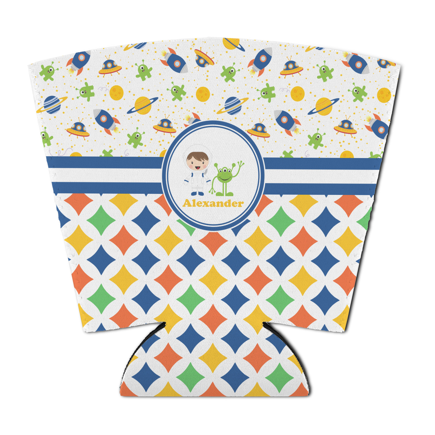 A blue and white band is placed in the middle of the design and used to showcase your little space traveler and his martian buddy. Add your own personalization for that special touch.