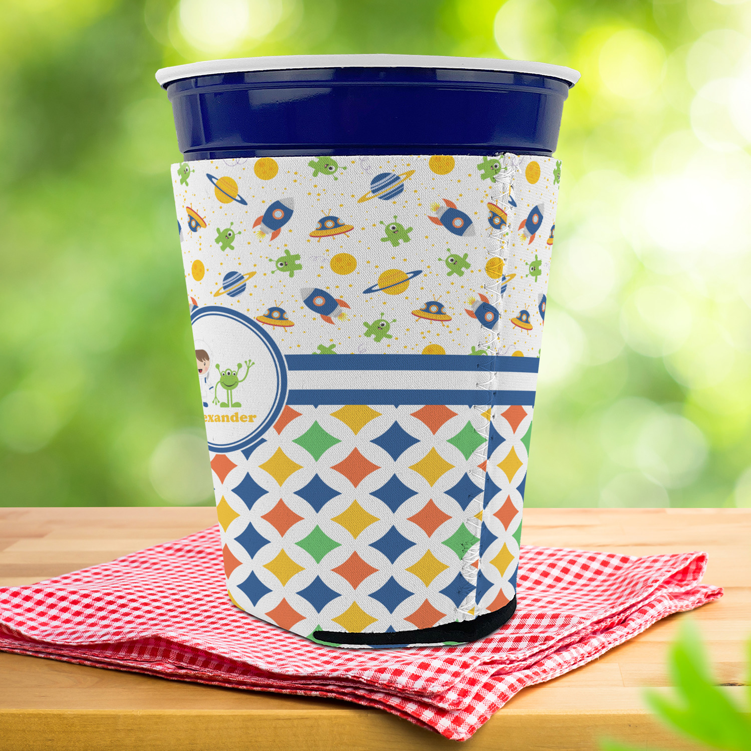 Made from neoprene with a polyester outer fabric and sewn seams, these premium quality party cup sleeves are very durable and will hold up to heavy use. They are available in 2 styles - with a bottom or just a sleeve to go around the outside of the tapered cup. The sleeve covers are about 4" tall and cover about 90% of the classic 16 oz. Solo cup.