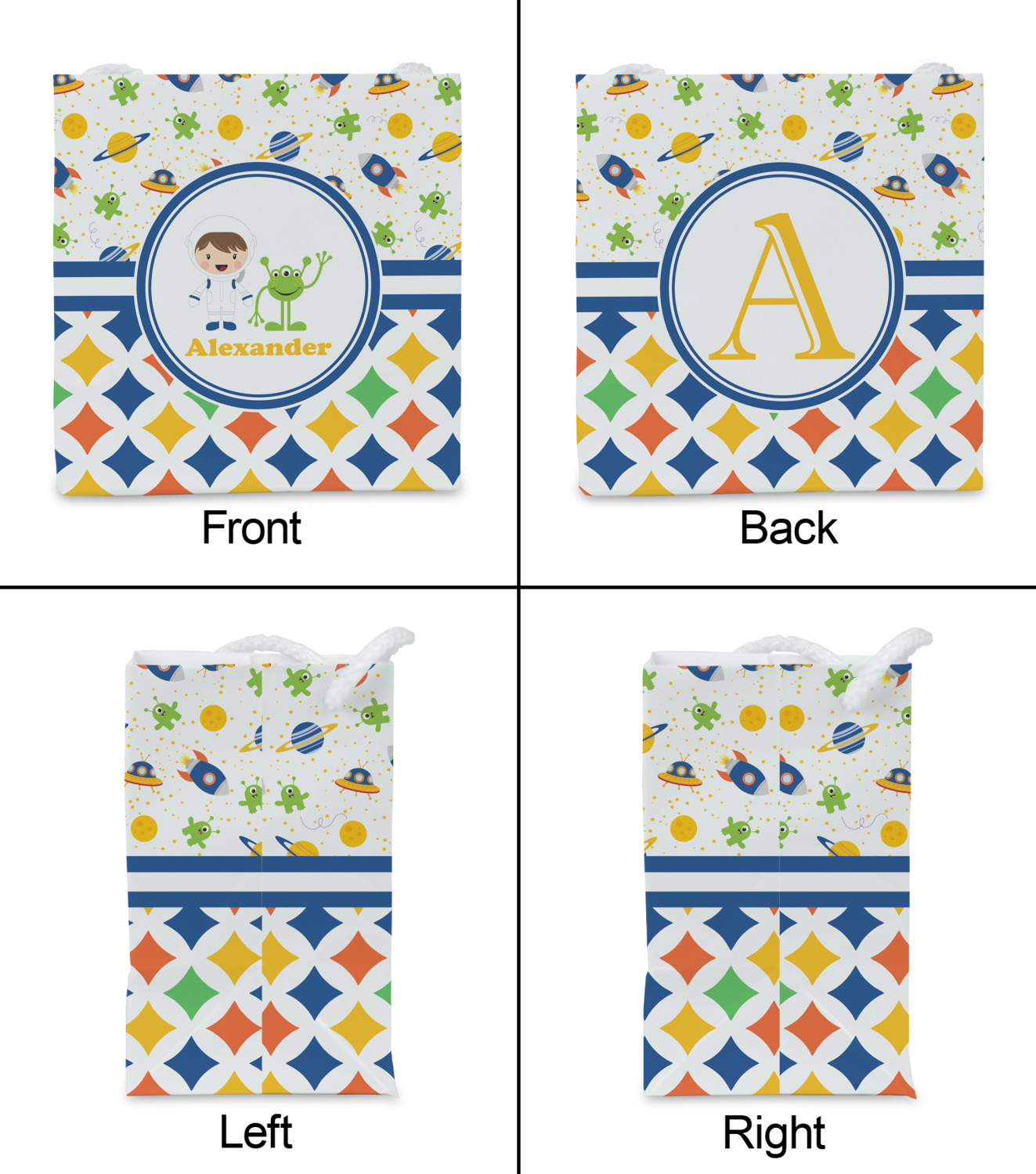 A blue and white band is placed in the middle of the design and used to showcase your little space traveler and his martian buddy. Add your own personalization for that special touch.