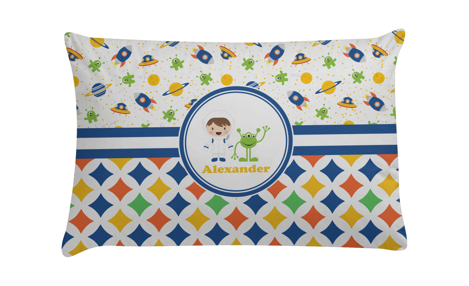 Explore another galaxy with this whimsical space design. Fun colors of blue, orange, yellow, and green make this space exploration come alive. The design is full of little green martians, blue and orange rockets, blue, yellow, and orange spaceships, yellow and blue planets, and yellow stars galore. A retro-future diamond pattern using coordinating colors makes this design outta this world!