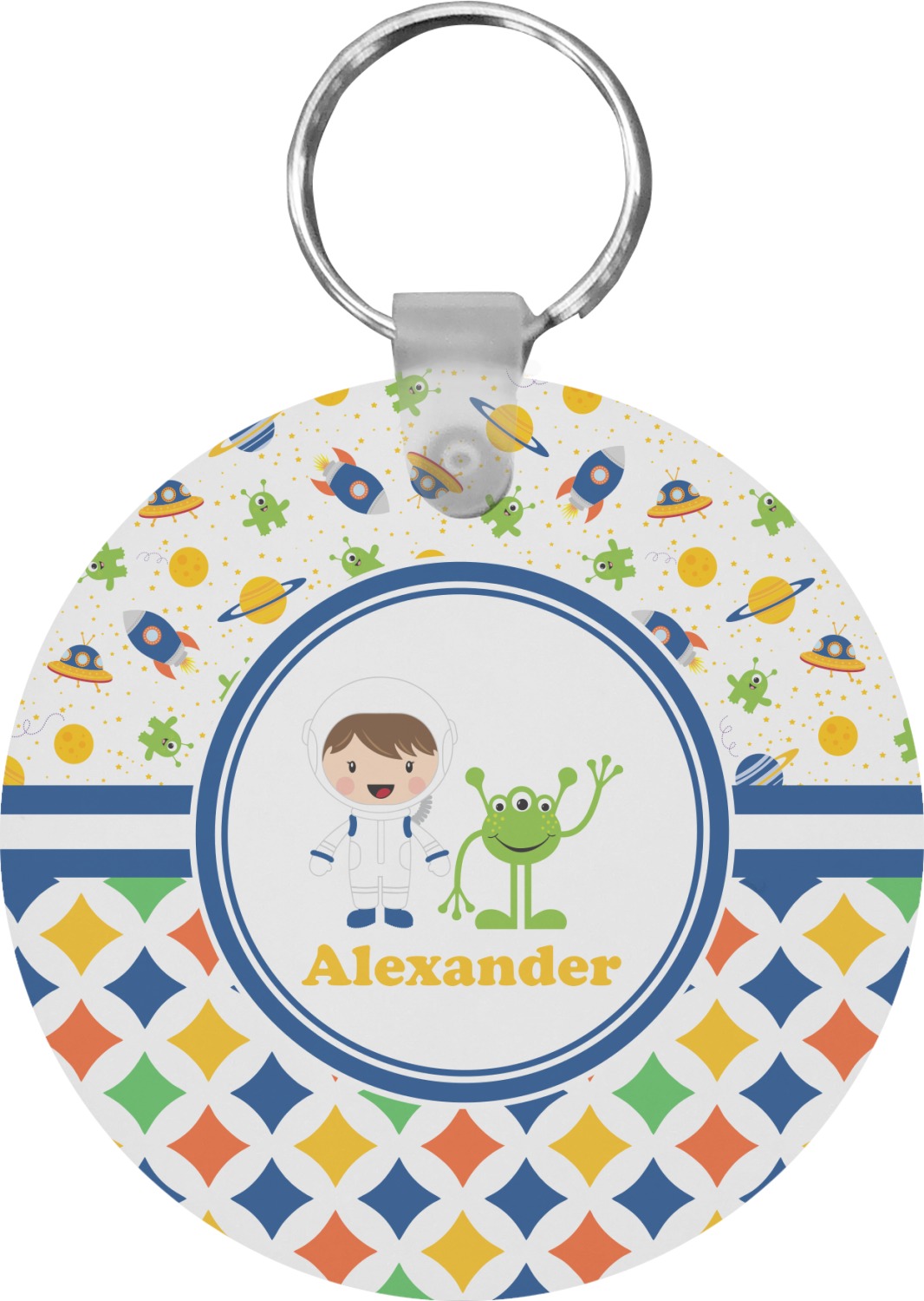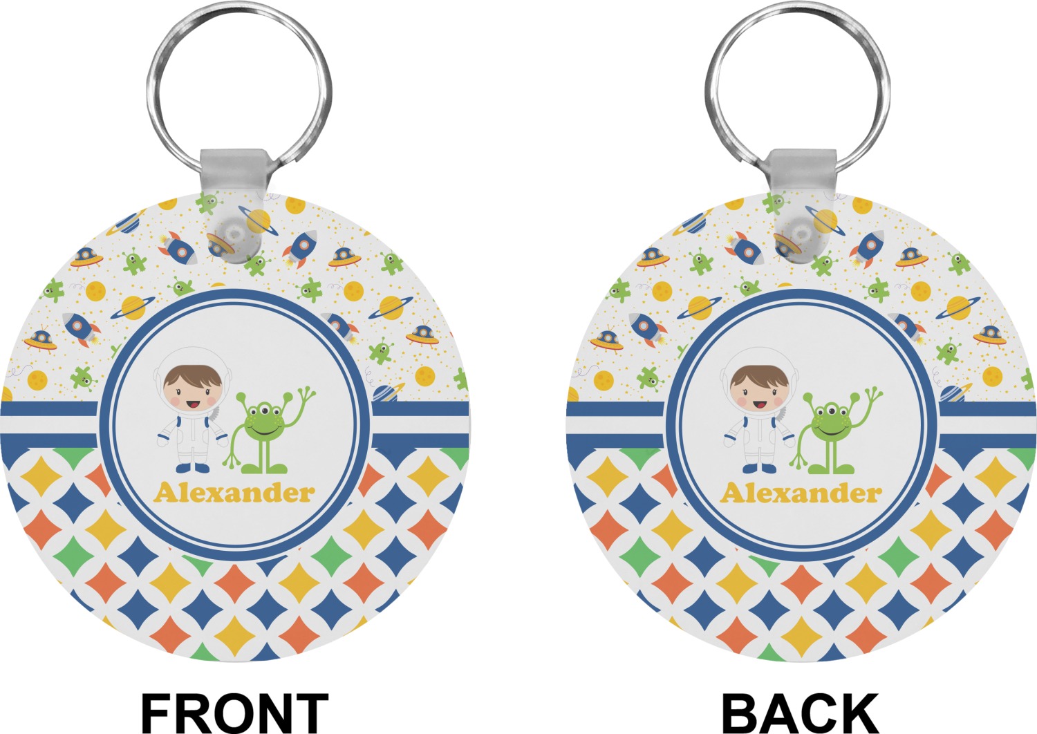 Our personalized keychains attach to the included metal, split key ring with a plastic, removable snap. Since a metal ring is included with your purchase, you have the liberty to keep your keys together on the ring, with or without your unique keychain. We offer this keychain in three different shapes: circle, heart, or diamond. We print your personalized design(s) on both sides of the key chain, and the surface has a glossy, reflective finish that only emphasizes your design. Each keychain is approximately 2.25 by 2.25 inches.