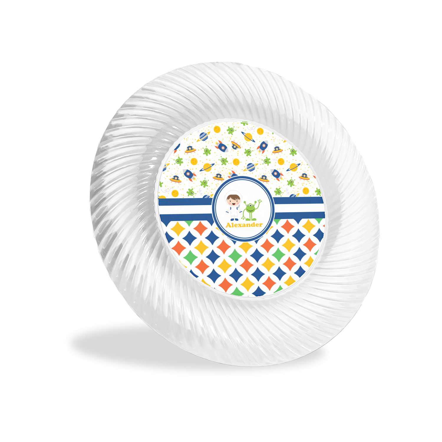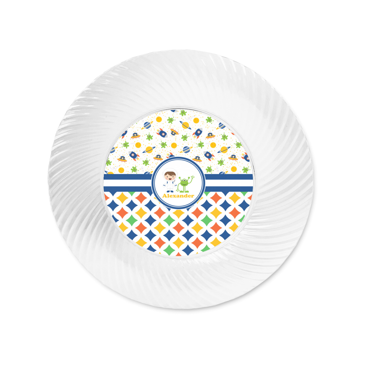 Made from a beautiful clear plastic plate as a base, your design is printed to the underside of the plate. The outside of the plate has a classic swirl texture to it for a high quality look and feel.