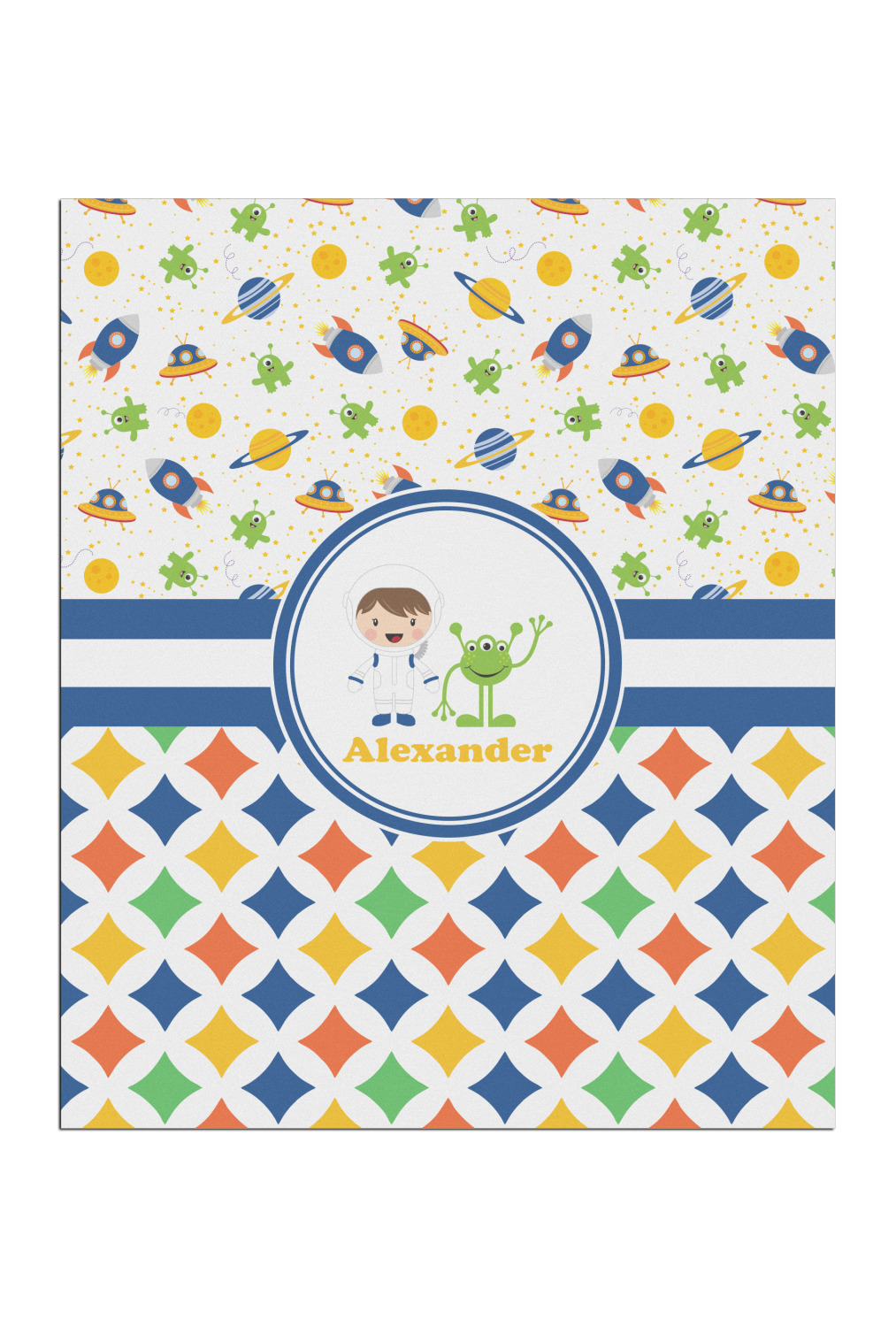 Explore another galaxy with this whimsical space design. Fun colors of blue, orange, yellow, and green make this space exploration come alive. The design is full of little green martians, blue and orange rockets, blue, yellow, and orange spaceships, yellow and blue planets, and yellow stars galore. A retro-future diamond pattern using coordinating colors makes this design outta this world!