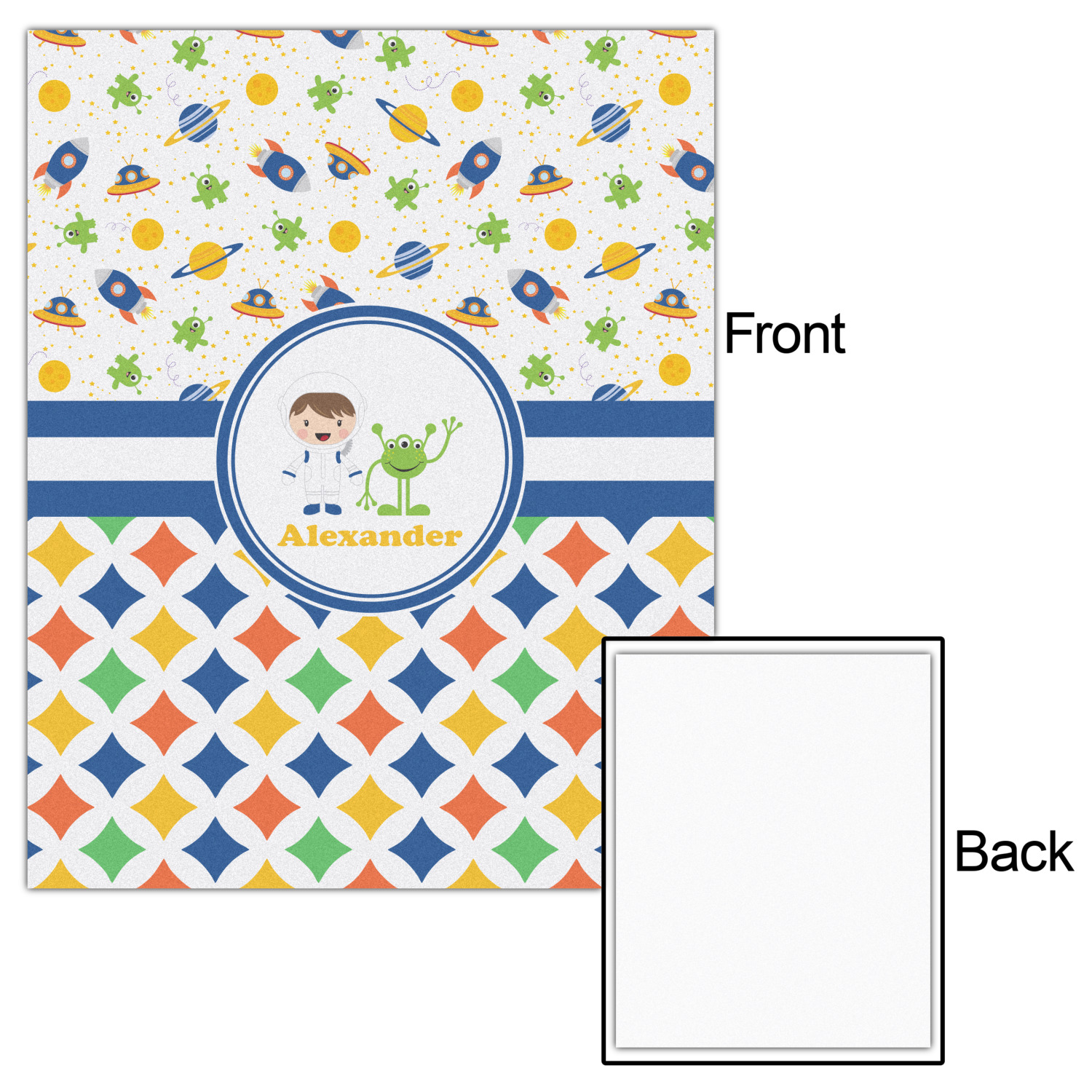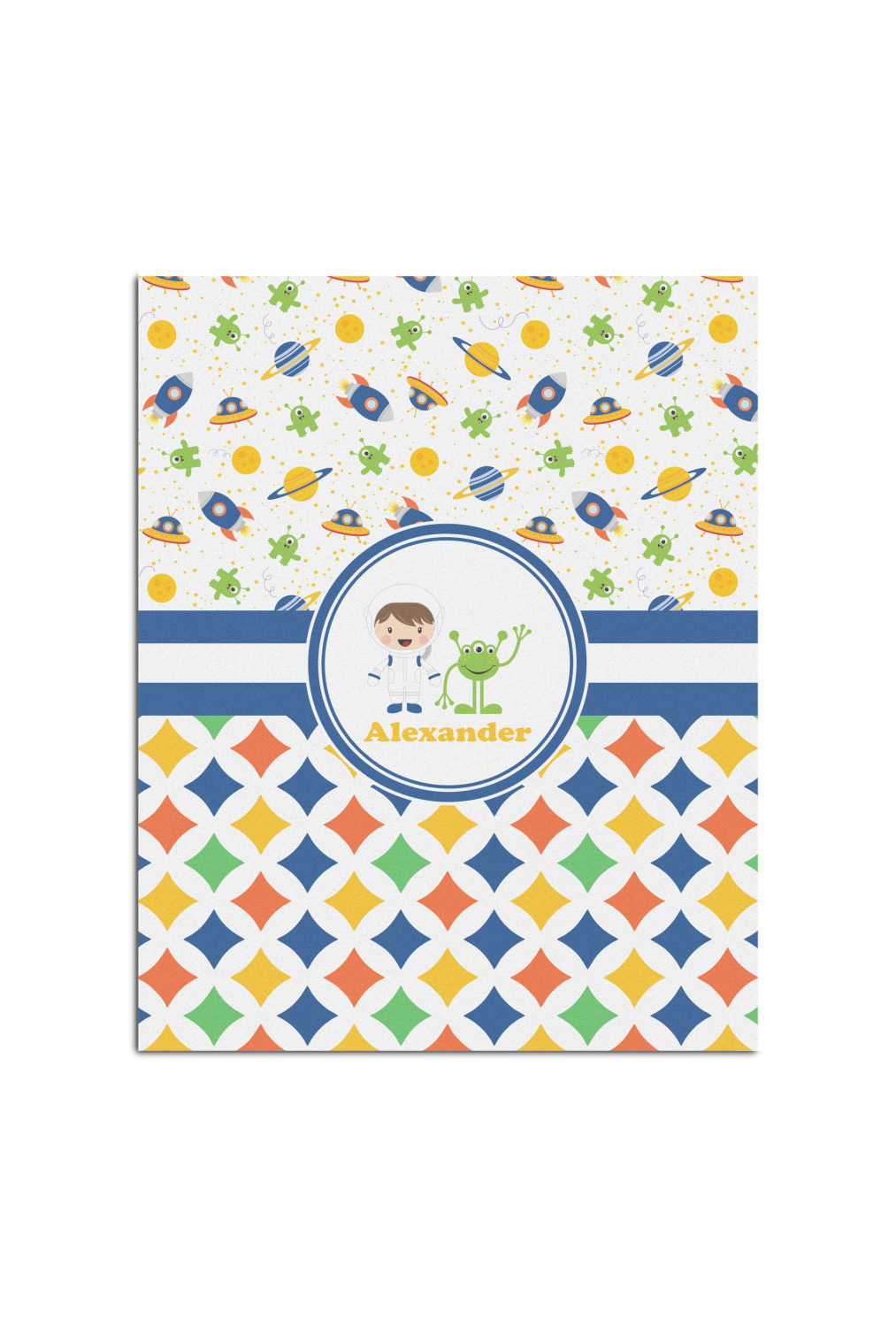 A blue and white band is placed in the middle of the design and used to showcase your little space traveler and his martian buddy. Add your own personalization for that special touch.