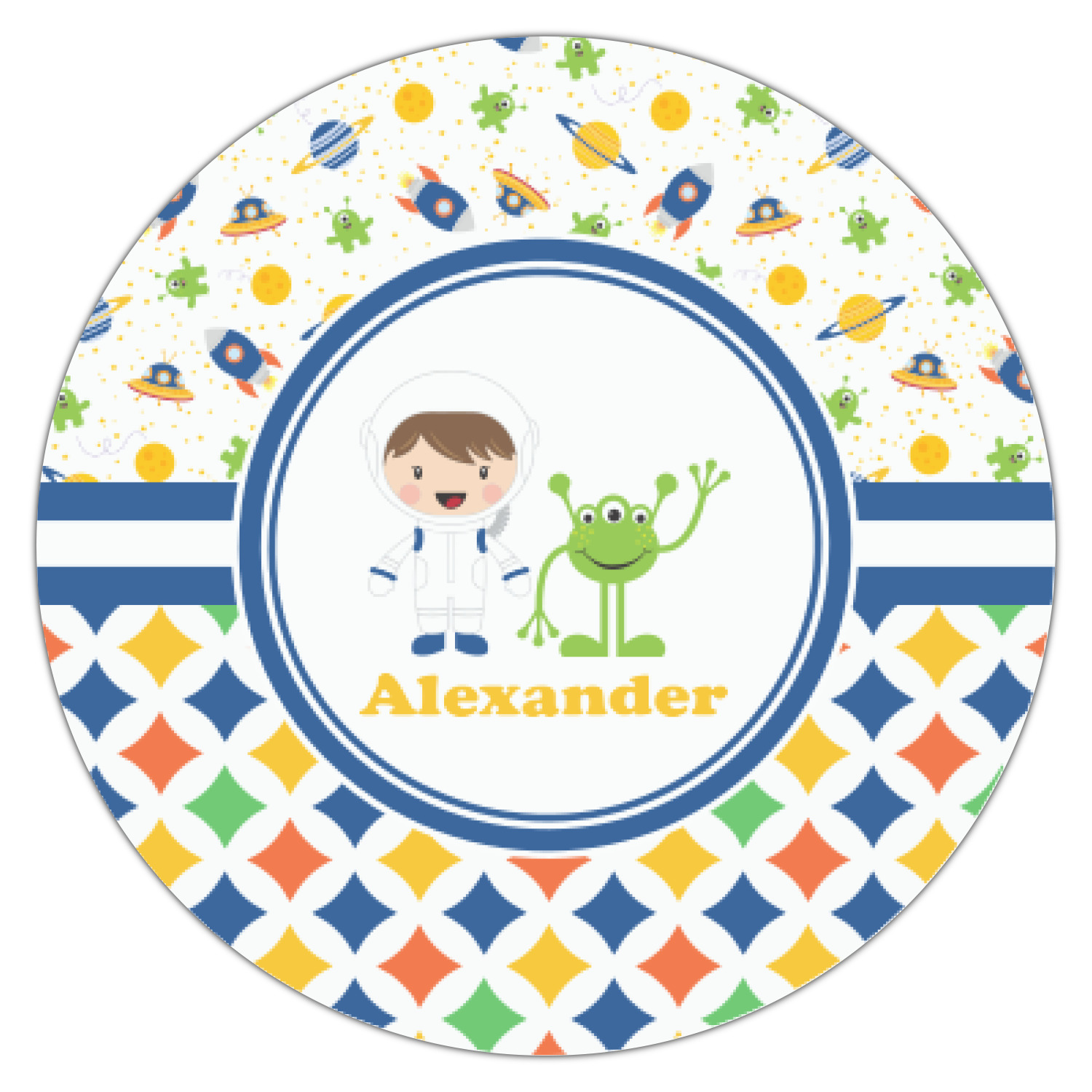 A blue and white band is placed in the middle of the design and used to showcase your little space traveler and his martian buddy. Add your own personalization for that special touch.