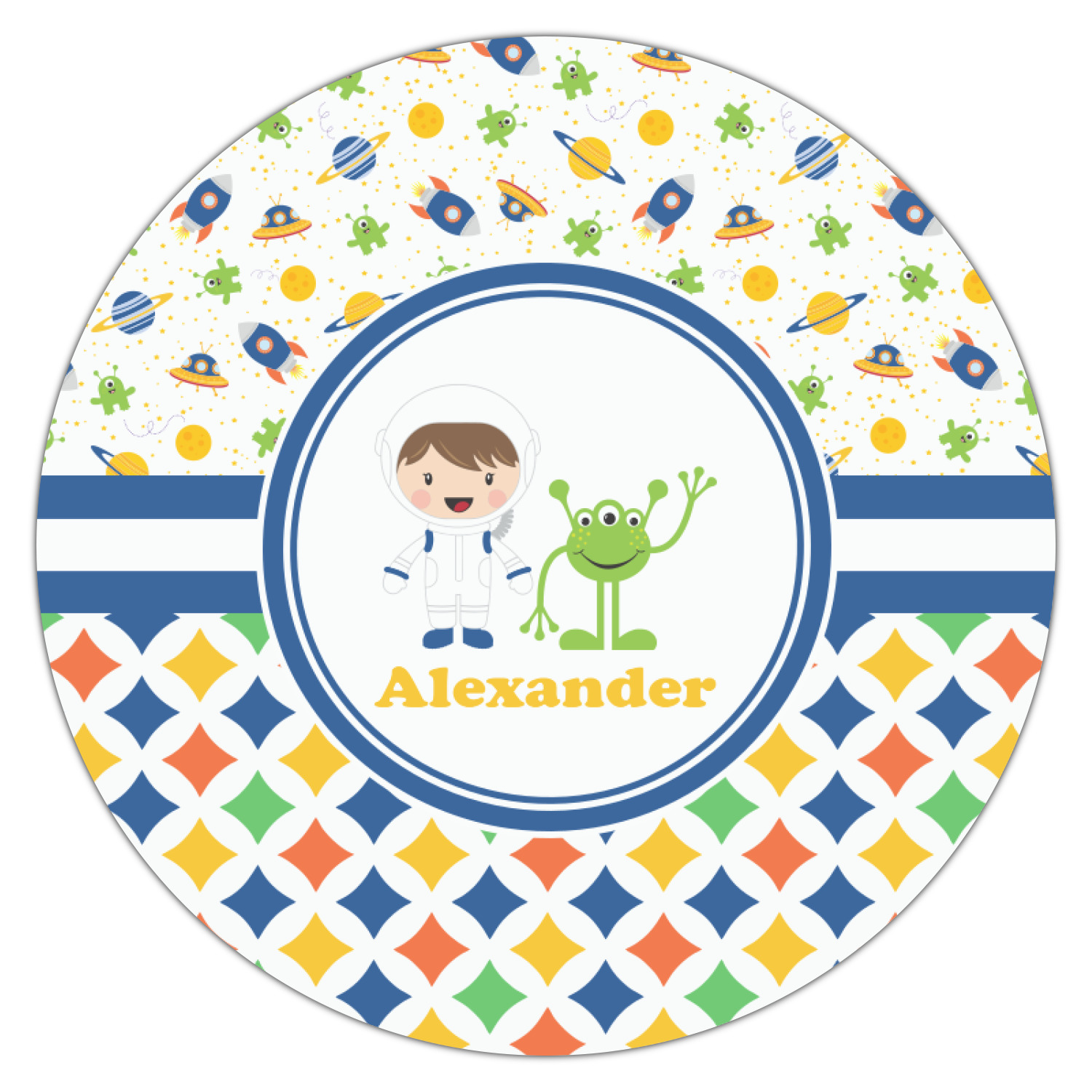 A blue and white band is placed in the middle of the design and used to showcase your little space traveler and his martian buddy. Add your own personalization for that special touch.
