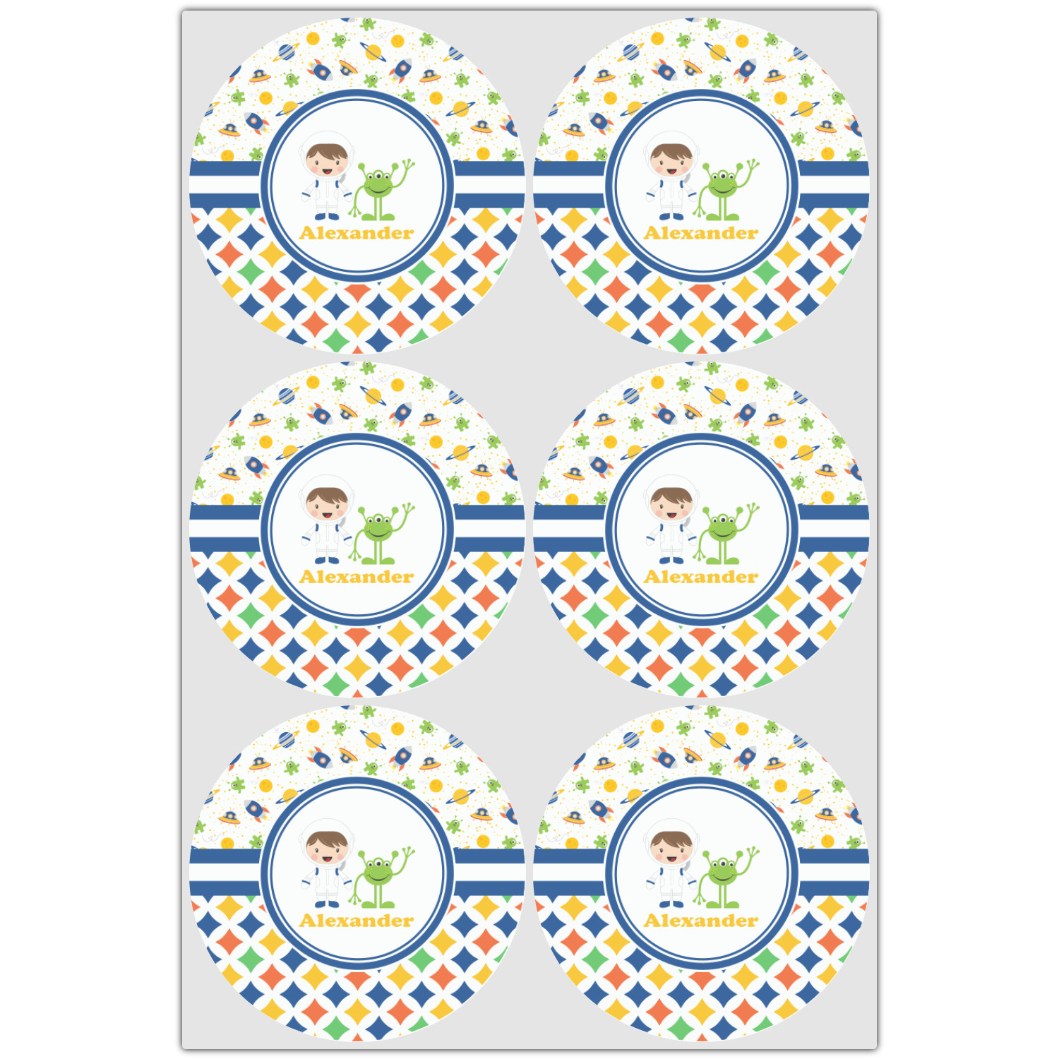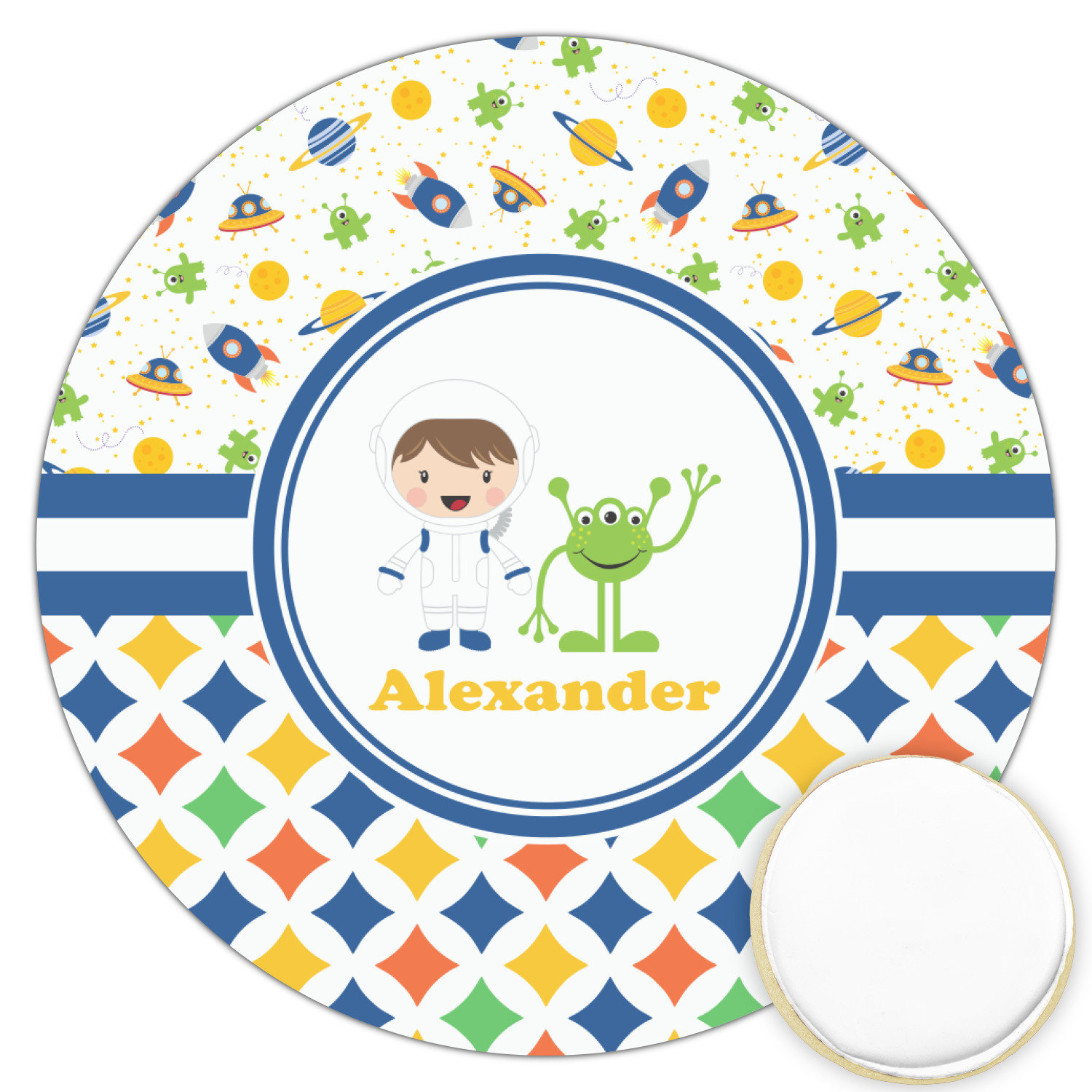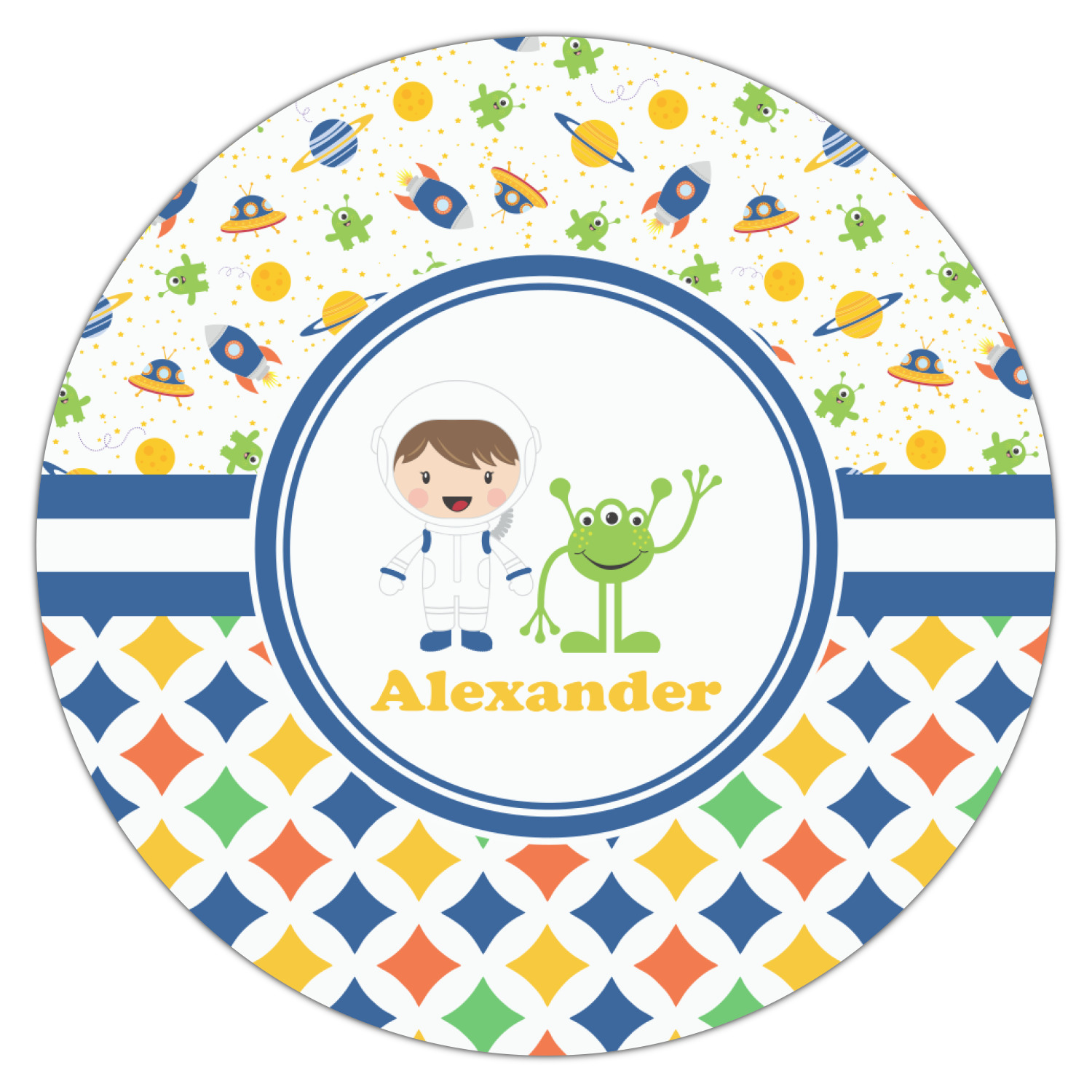 A blue and white band is placed in the middle of the design and used to showcase your little space traveler and his martian buddy. Add your own personalization for that special touch.