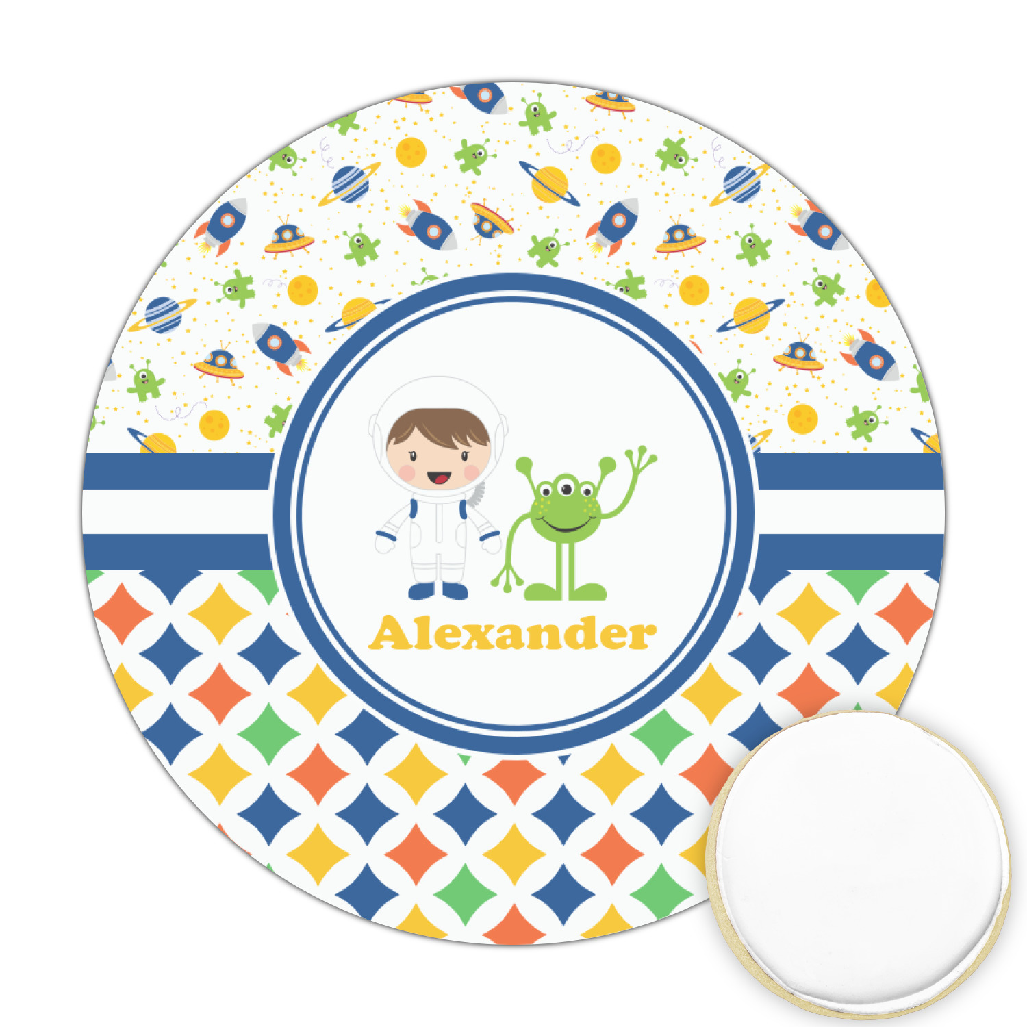 A blue and white band is placed in the middle of the design and used to showcase your little space traveler and his martian buddy. Add your own personalization for that special touch.