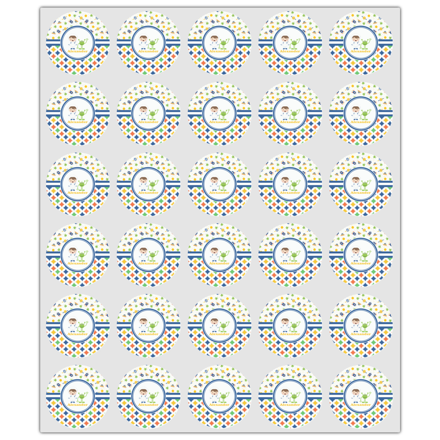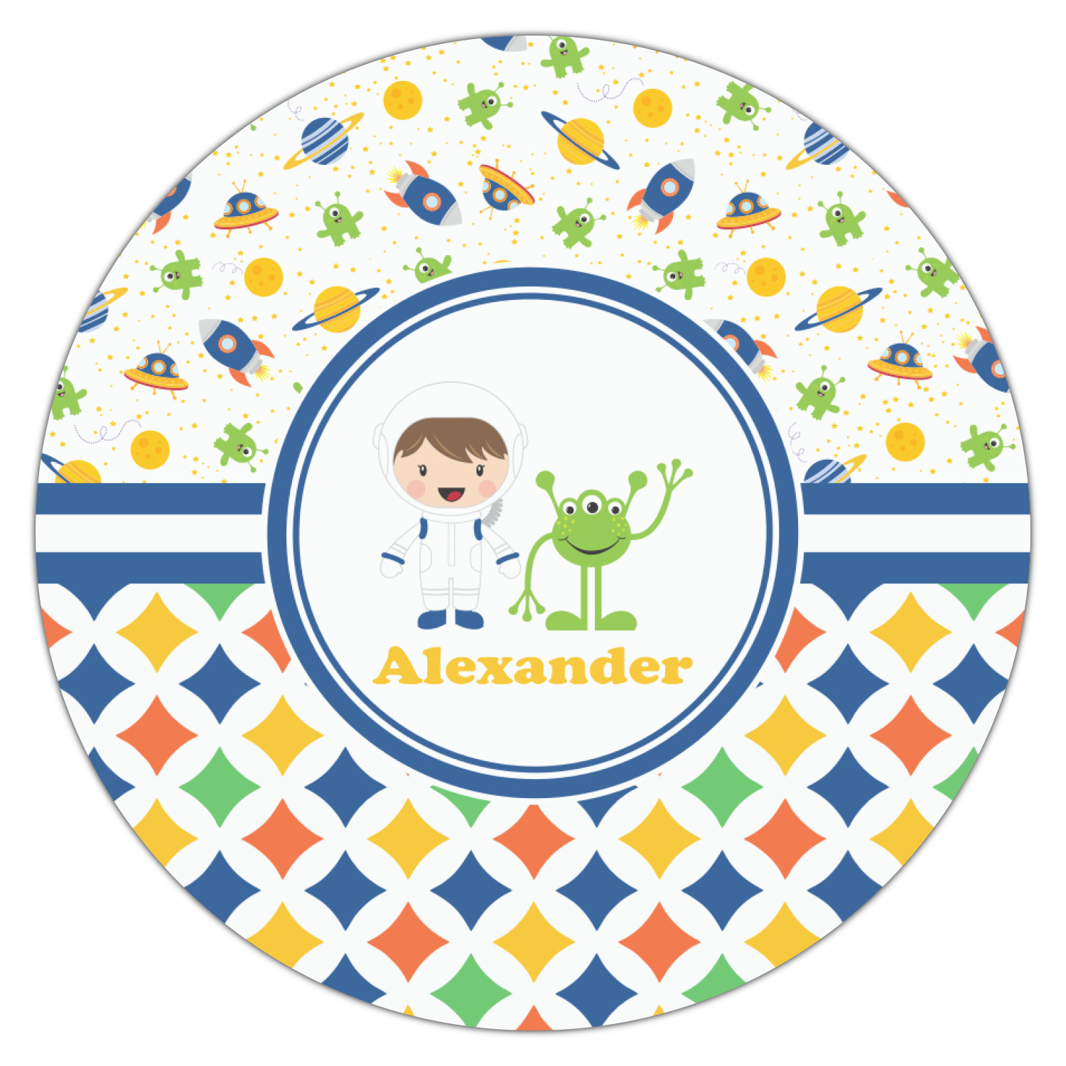 A blue and white band is placed in the middle of the design and used to showcase your little space traveler and his martian buddy. Add your own personalization for that special touch.