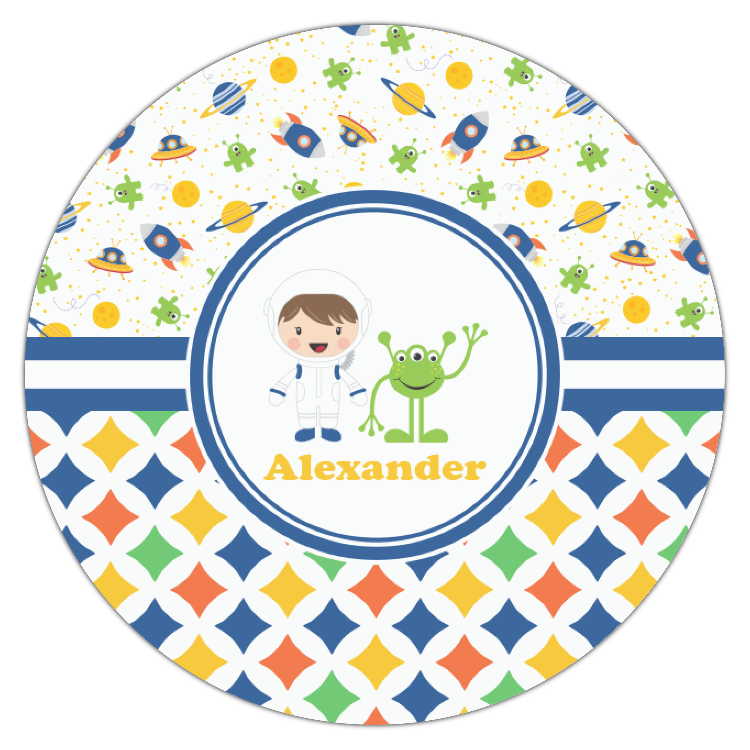 A blue and white band is placed in the middle of the design and used to showcase your little space traveler and his martian buddy. Add your own personalization for that special touch.
