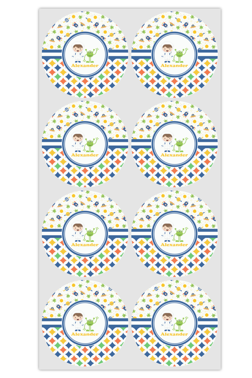 A blue and white band is placed in the middle of the design and used to showcase your little space traveler and his martian buddy. Add your own personalization for that special touch.