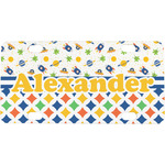 A blue and white band is placed in the middle of the design and used to showcase your little space traveler and his martian buddy. Add your own personalization for that special touch.