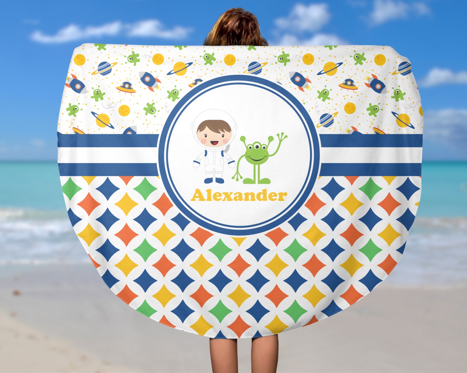 Think out of the box on your next beach, pool, or picnic day in style on your personalized round towel. This must have durable accessory is the perfect size for keeping you, and your possessions out of the sand. Sprawl out in the sun without getting your hands dirty, the unique round design allows for a full range of motion.