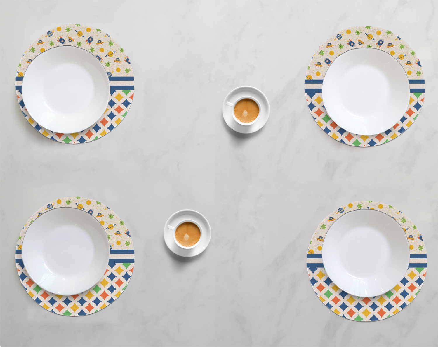 Explore another galaxy with this whimsical space design. Fun colors of blue, orange, yellow, and green make this space exploration come alive. The design is full of little green martians, blue and orange rockets, blue, yellow, and orange spaceships, yellow and blue planets, and yellow stars galore. A retro-future diamond pattern using coordinating colors makes this design outta this world!