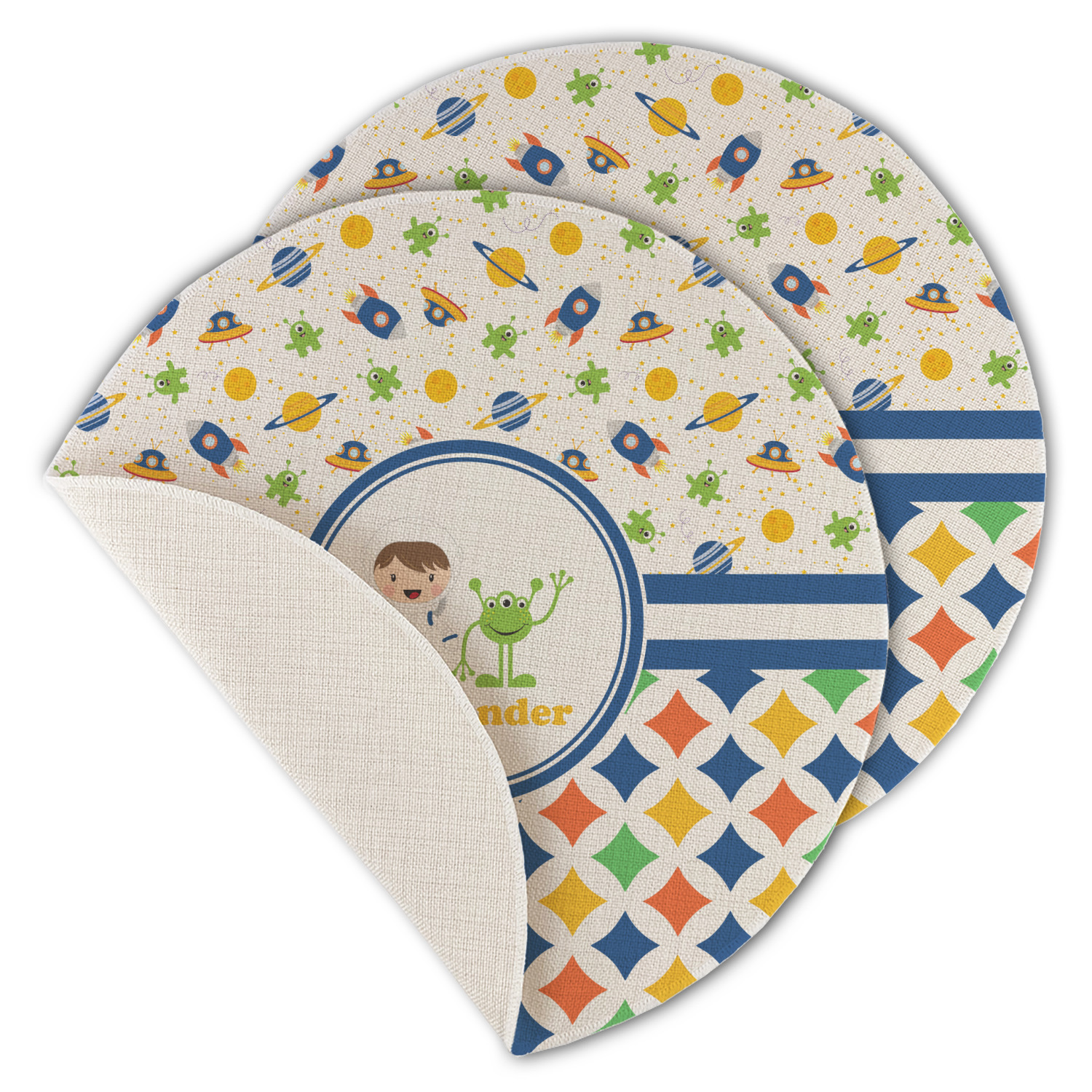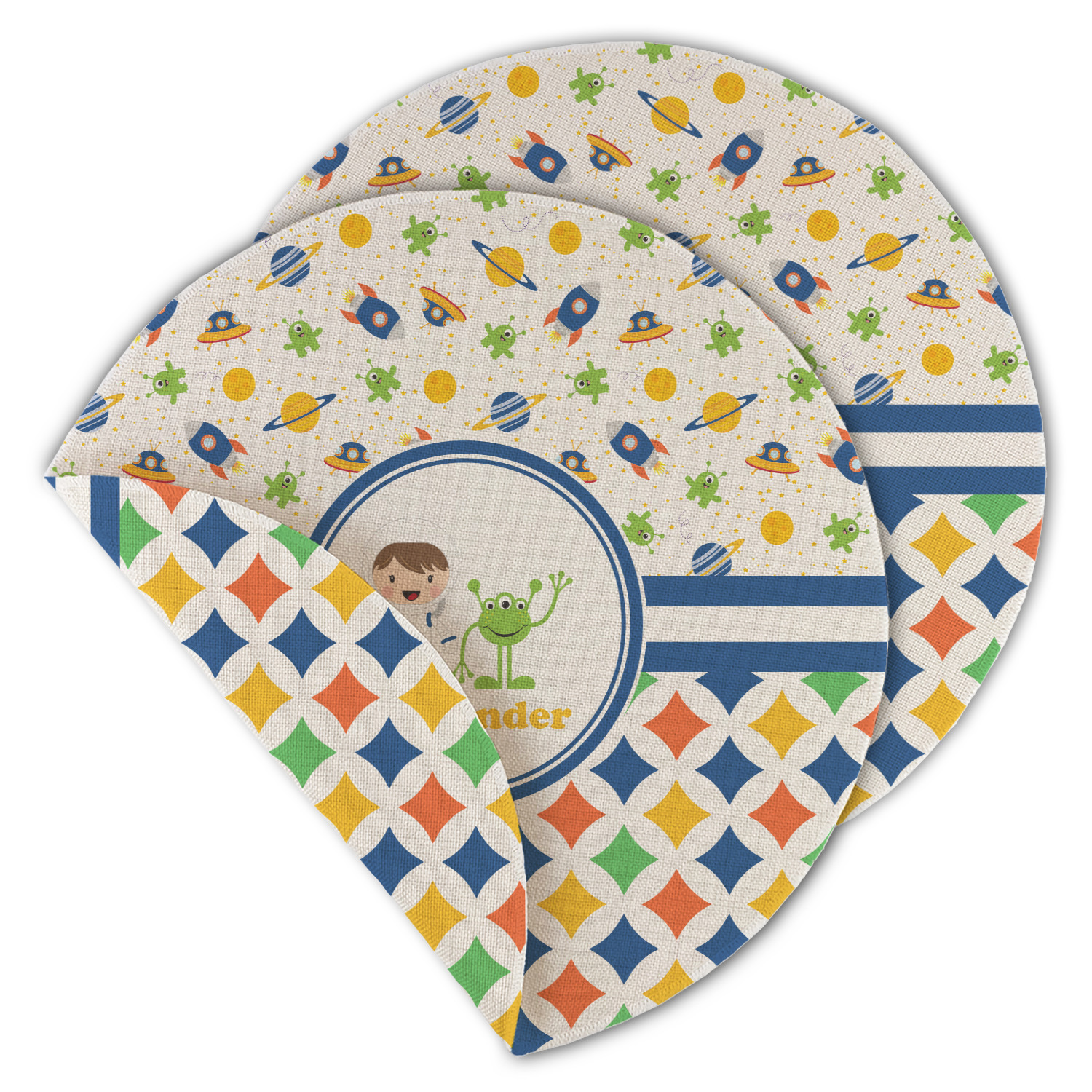 A blue and white band is placed in the middle of the design and used to showcase your little space traveler and his martian buddy. Add your own personalization for that special touch.