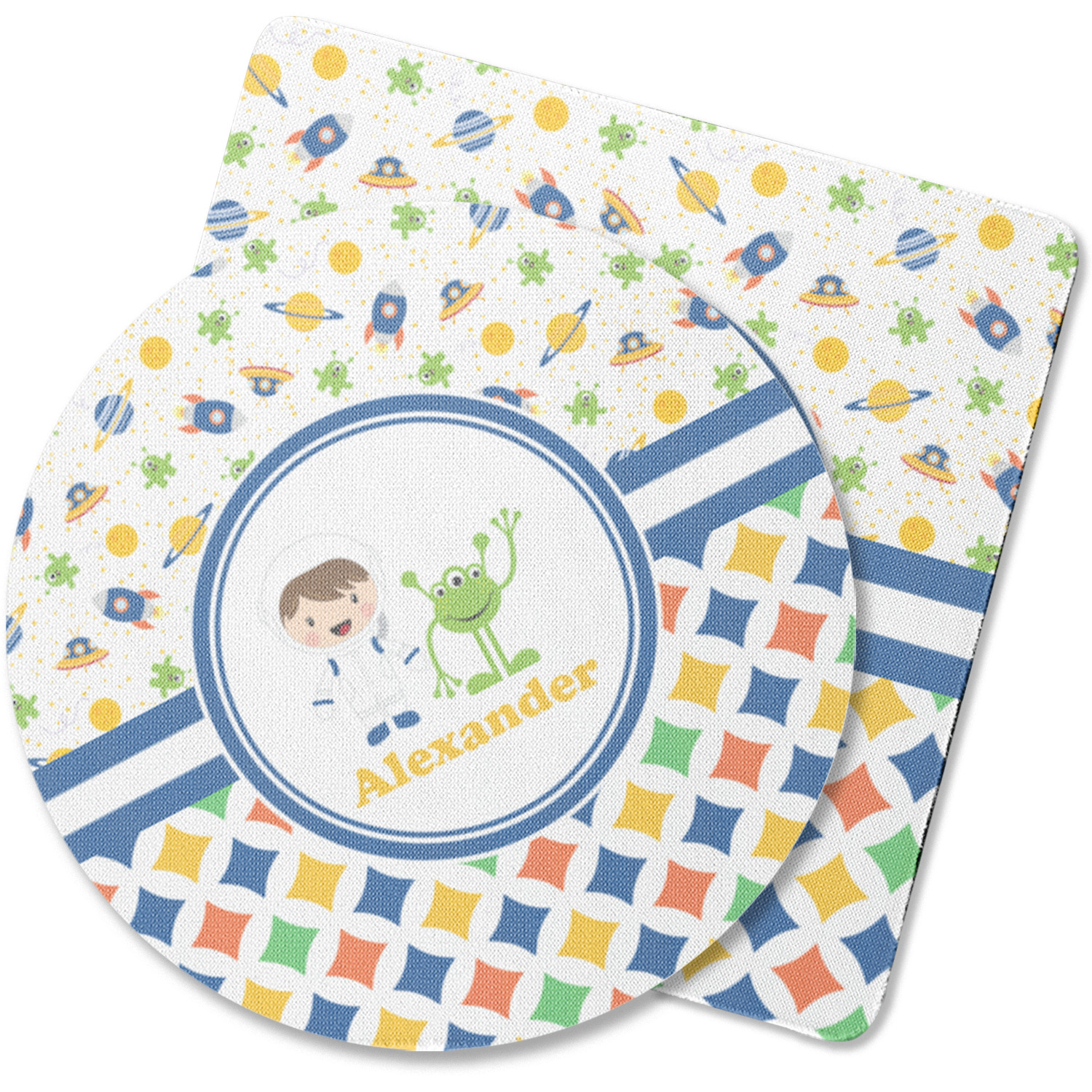 A blue and white band is placed in the middle of the design and used to showcase your little space traveler and his martian buddy. Add your own personalization for that special touch.