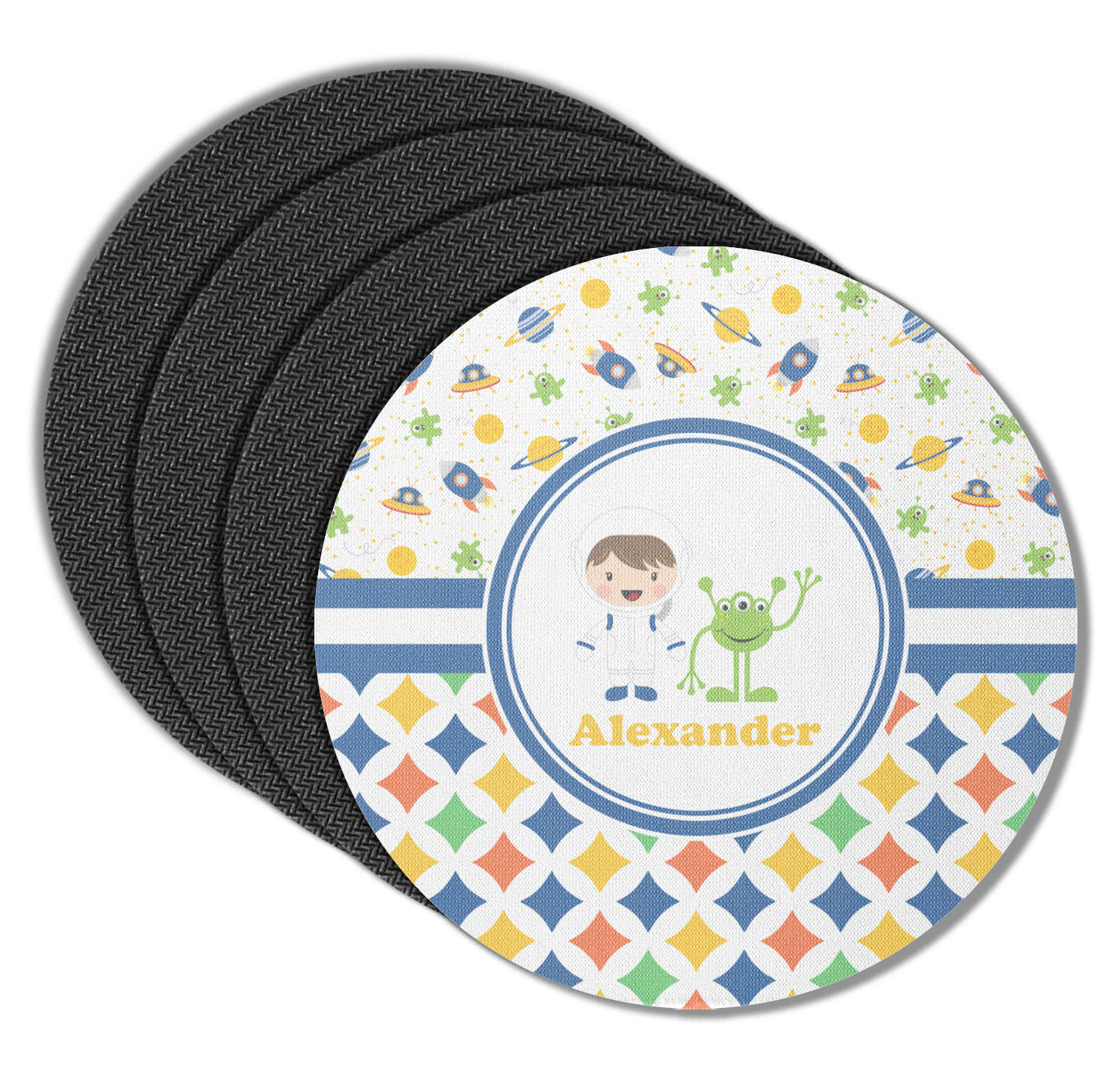 These drink coasters have a smooth, polyester top and a textured, rubber backing on its bottom. The non-slip rubber backing underneath works to keep any spills at bay. At 4 by 4 by 0.25 inches thick, these custom coasters are a suitable size for most drinkware. Your personalization is displayed atop the face of the cup coaster. We sell these rubber coasters in two different shapes: square and round. You can buy each shape as singulars or as a set of 4.