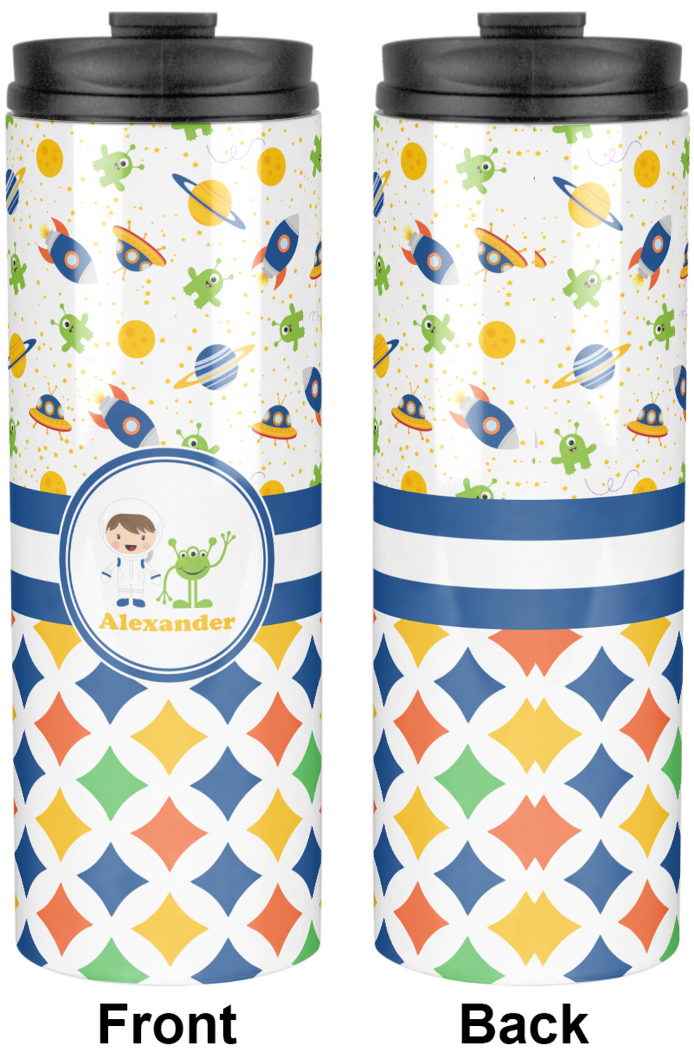 A blue and white band is placed in the middle of the design and used to showcase your little space traveler and his martian buddy. Add your own personalization for that special touch.