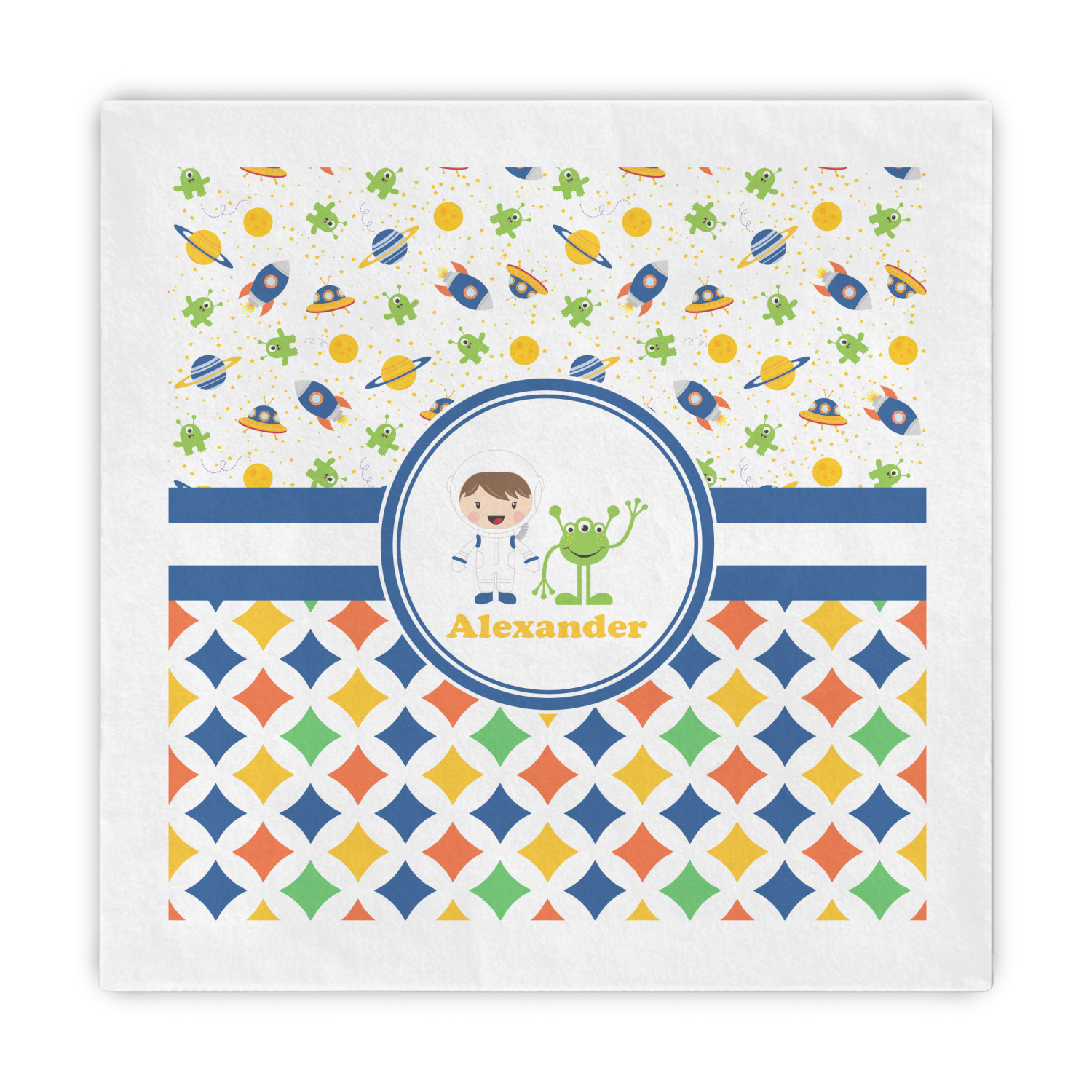 A blue and white band is placed in the middle of the design and used to showcase your little space traveler and his martian buddy. Add your own personalization for that special touch.