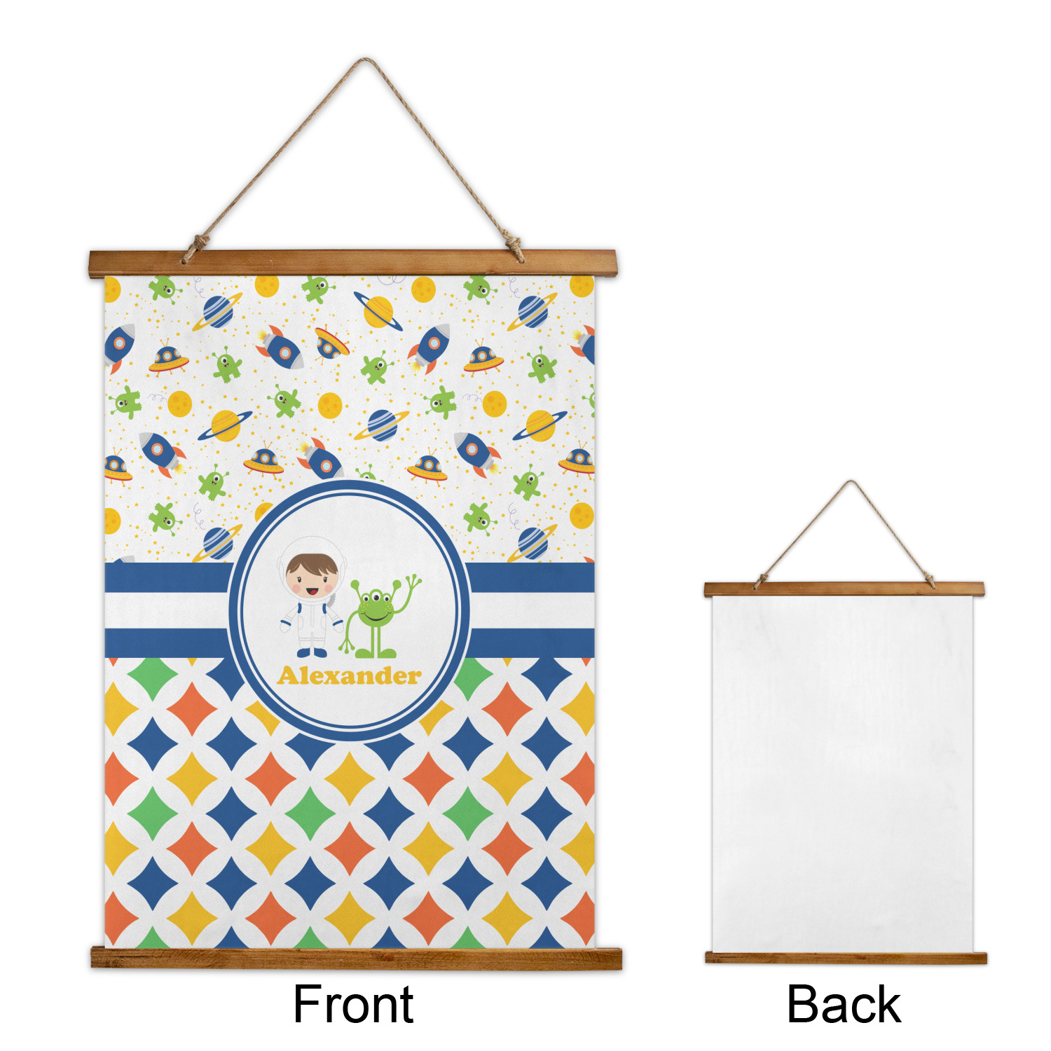 A blue and white band is placed in the middle of the design and used to showcase your little space traveler and his martian buddy. Add your own personalization for that special touch.