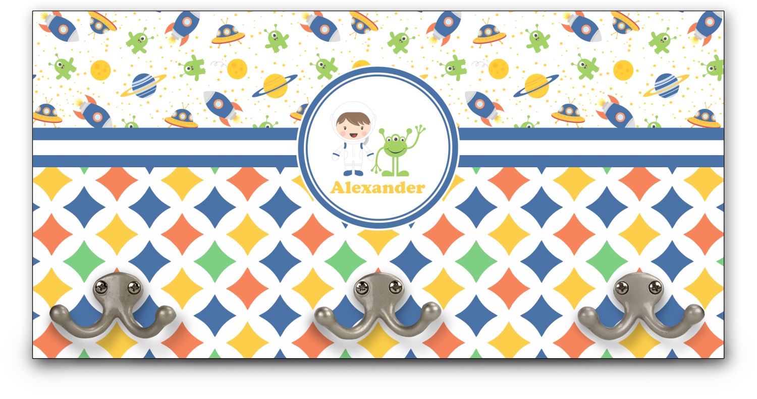 This coat rack is the perfect way to add some personality to your wall or entryway. The board is made of a strong maple that is approximately 16" x 8". The three 2-prong hooks are a sturdy metal that have three screws attaching them to the board. Your design is printed right onto the front of the board while the back and sides are a simple black.