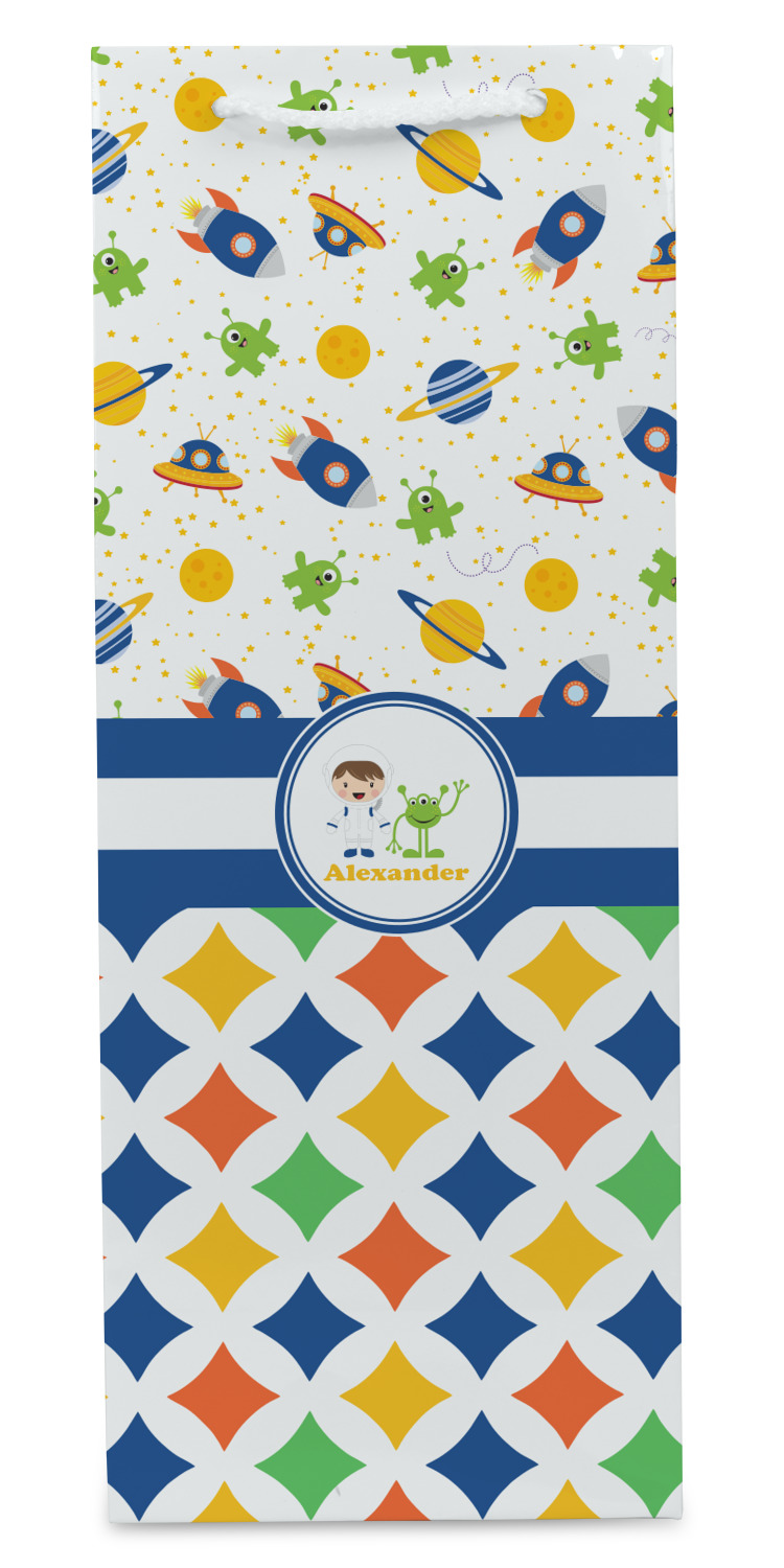 A blue and white band is placed in the middle of the design and used to showcase your little space traveler and his martian buddy. Add your own personalization for that special touch.