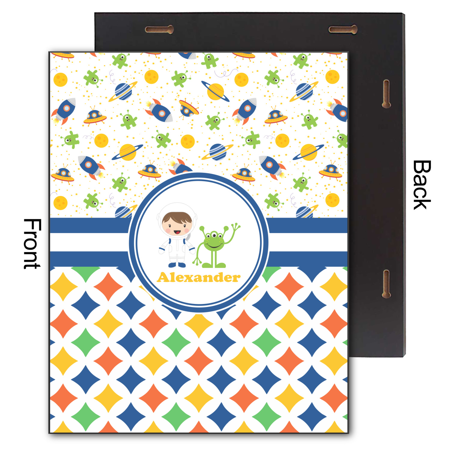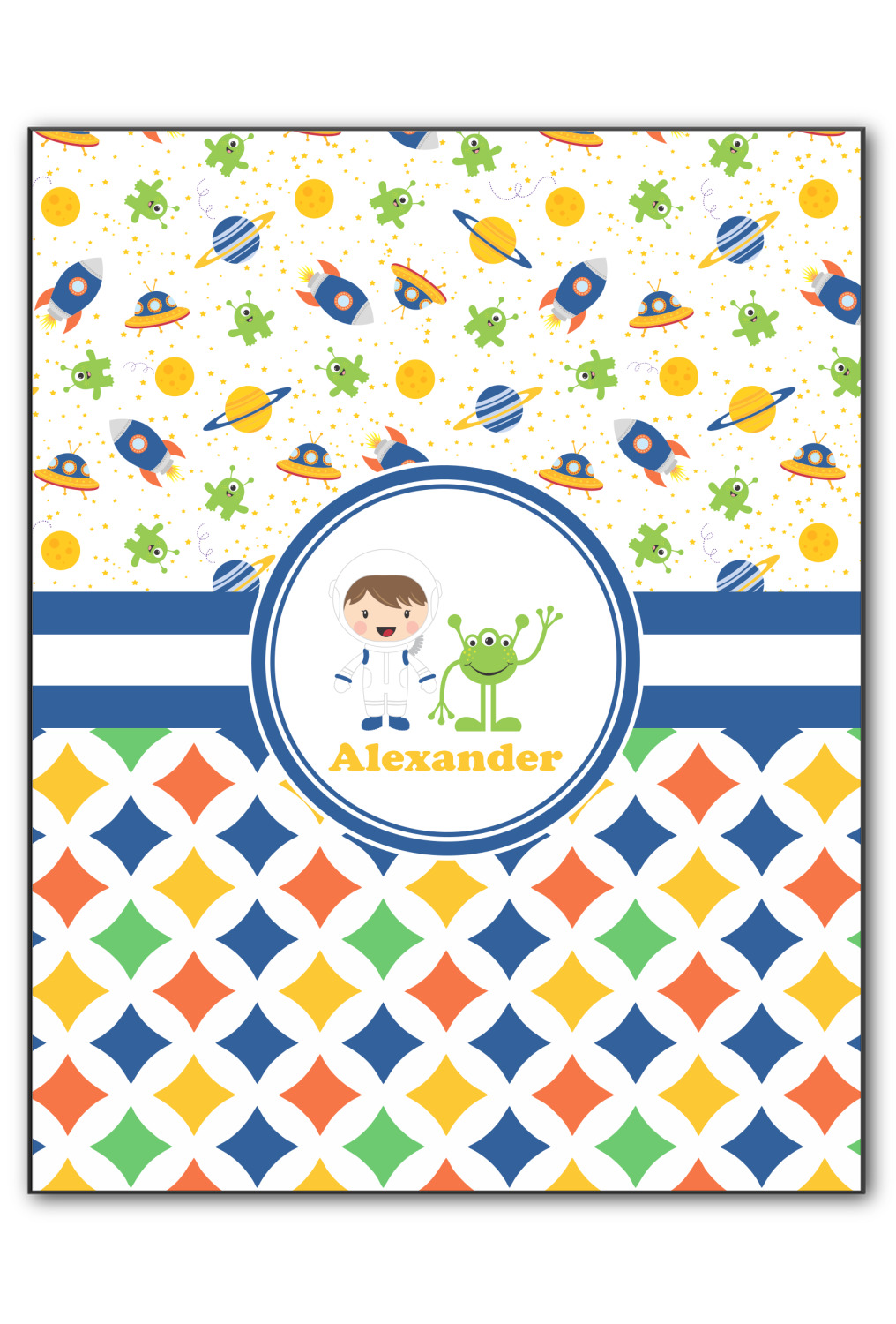 A blue and white band is placed in the middle of the design and used to showcase your little space traveler and his martian buddy. Add your own personalization for that special touch.