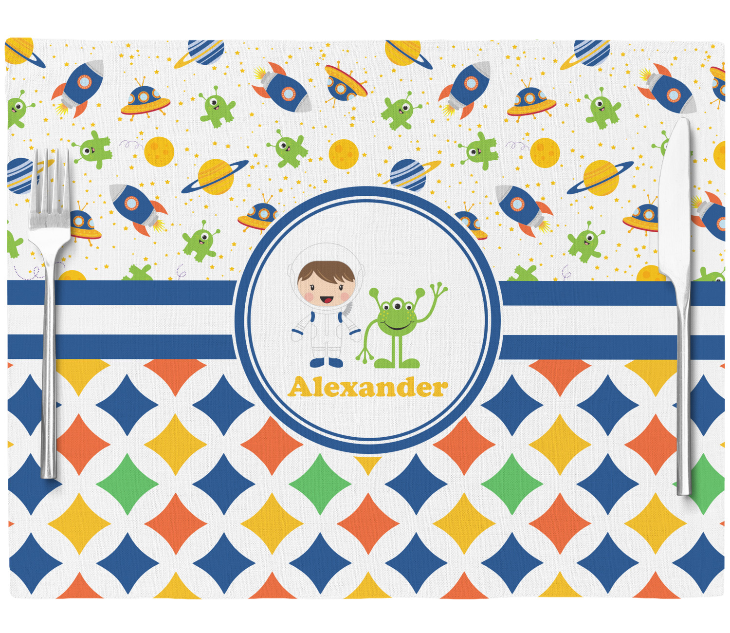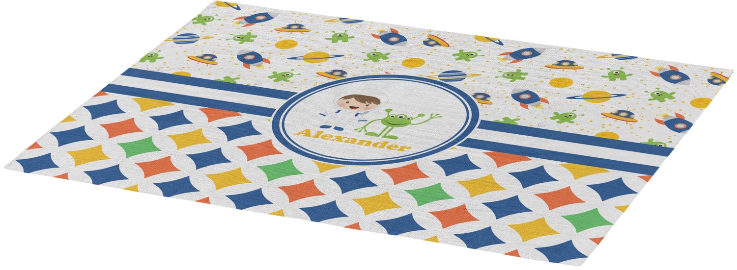 Each of our table mats are a poly twill material with woven burlap detailing. This creates a soft, quality placemat for us to fully print your personalized design across. The woven twill also adds a wrinkle-free surface to set your table! Each customizable placemat is a rectangle shape measuring at approximately 13 x 18 and printed here in the USA.