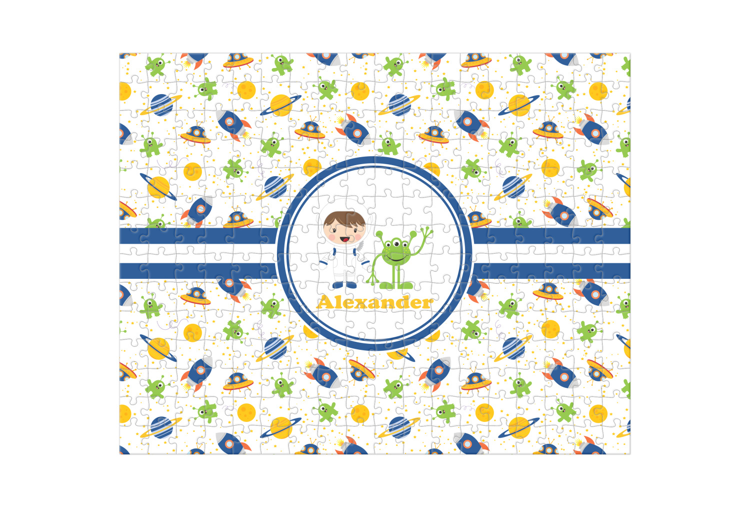 A blue and white band is placed in the middle of the design and used to showcase your little space traveler and his martian buddy. Add your own personalization for that special touch.